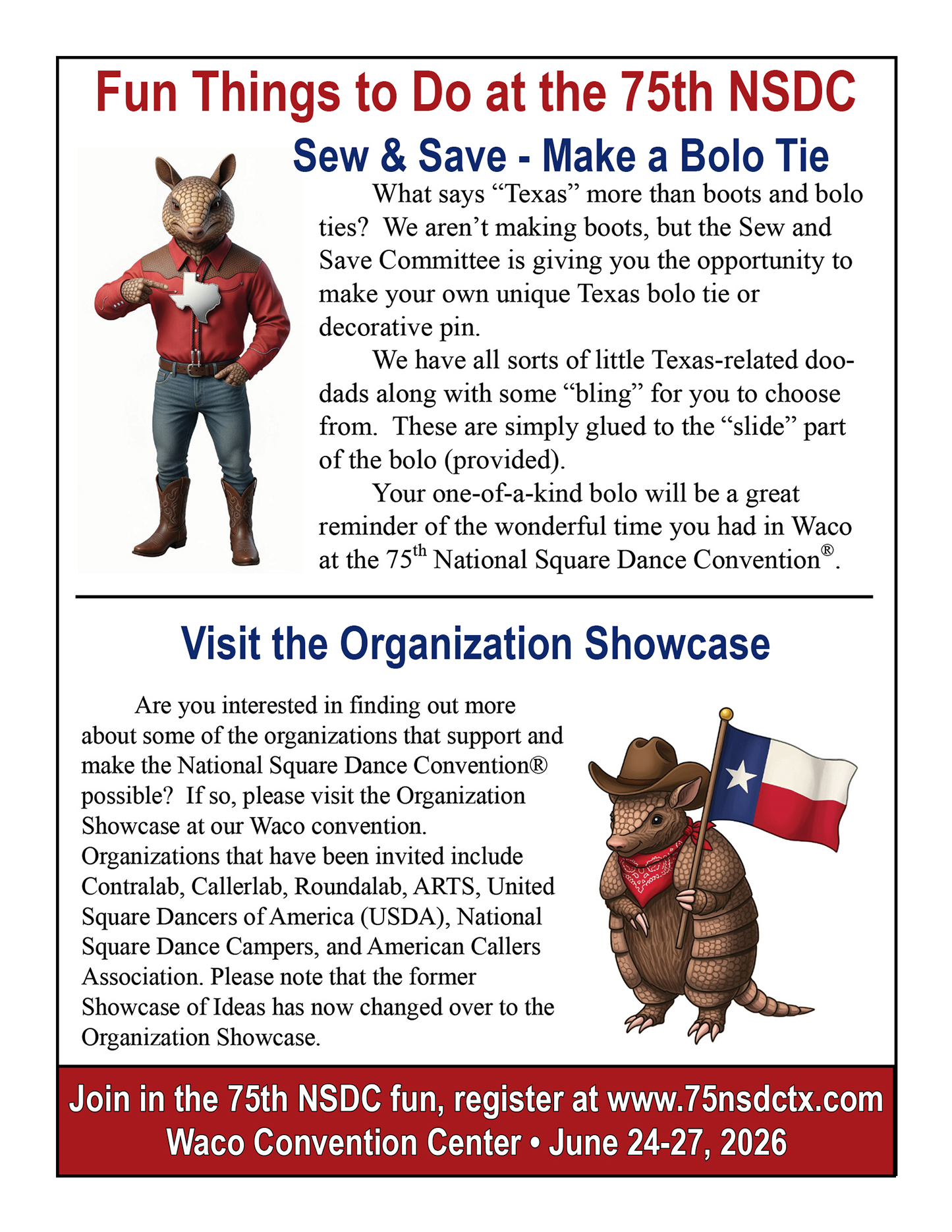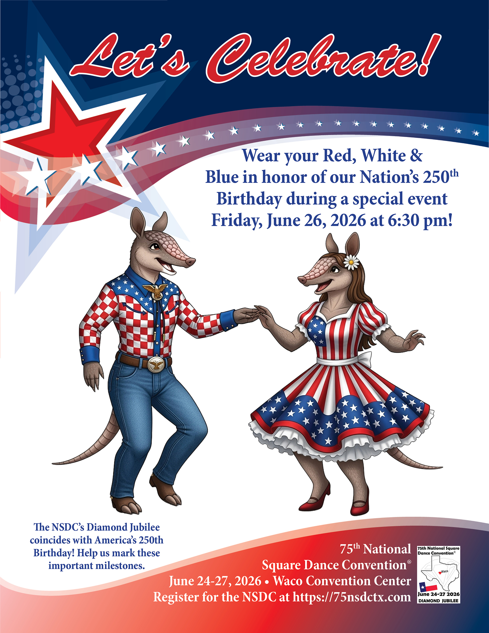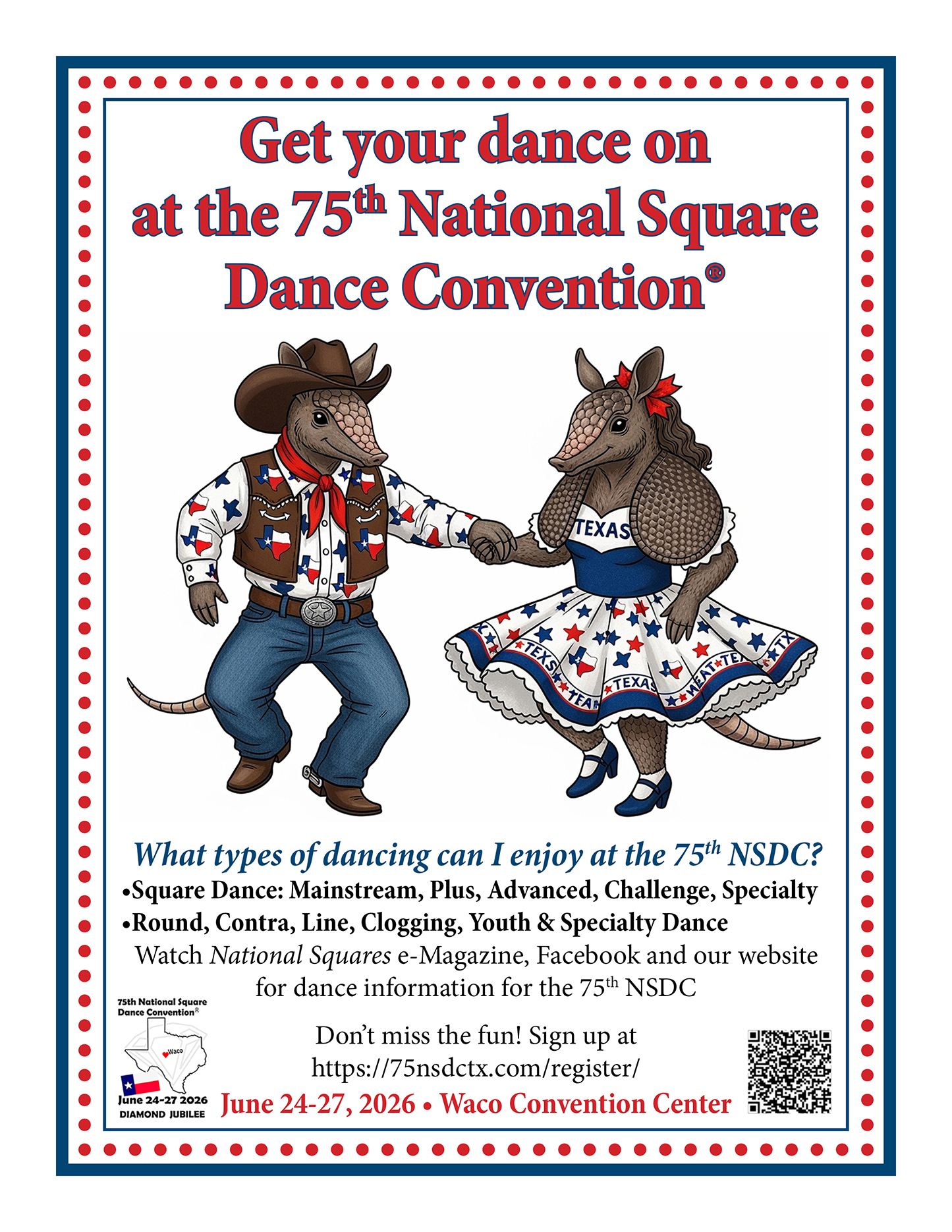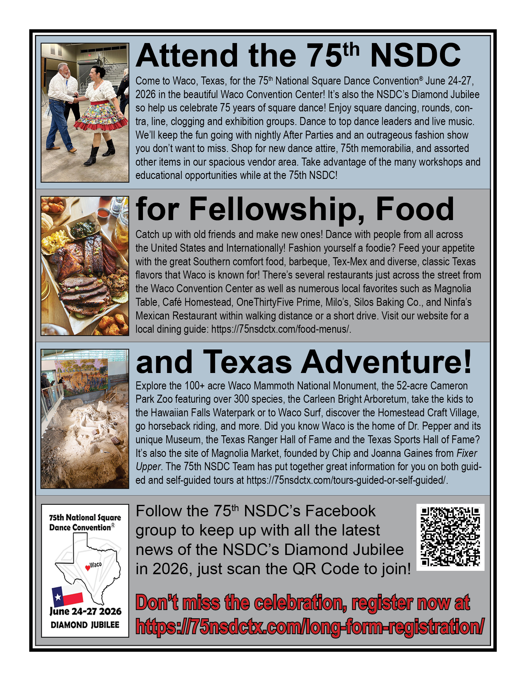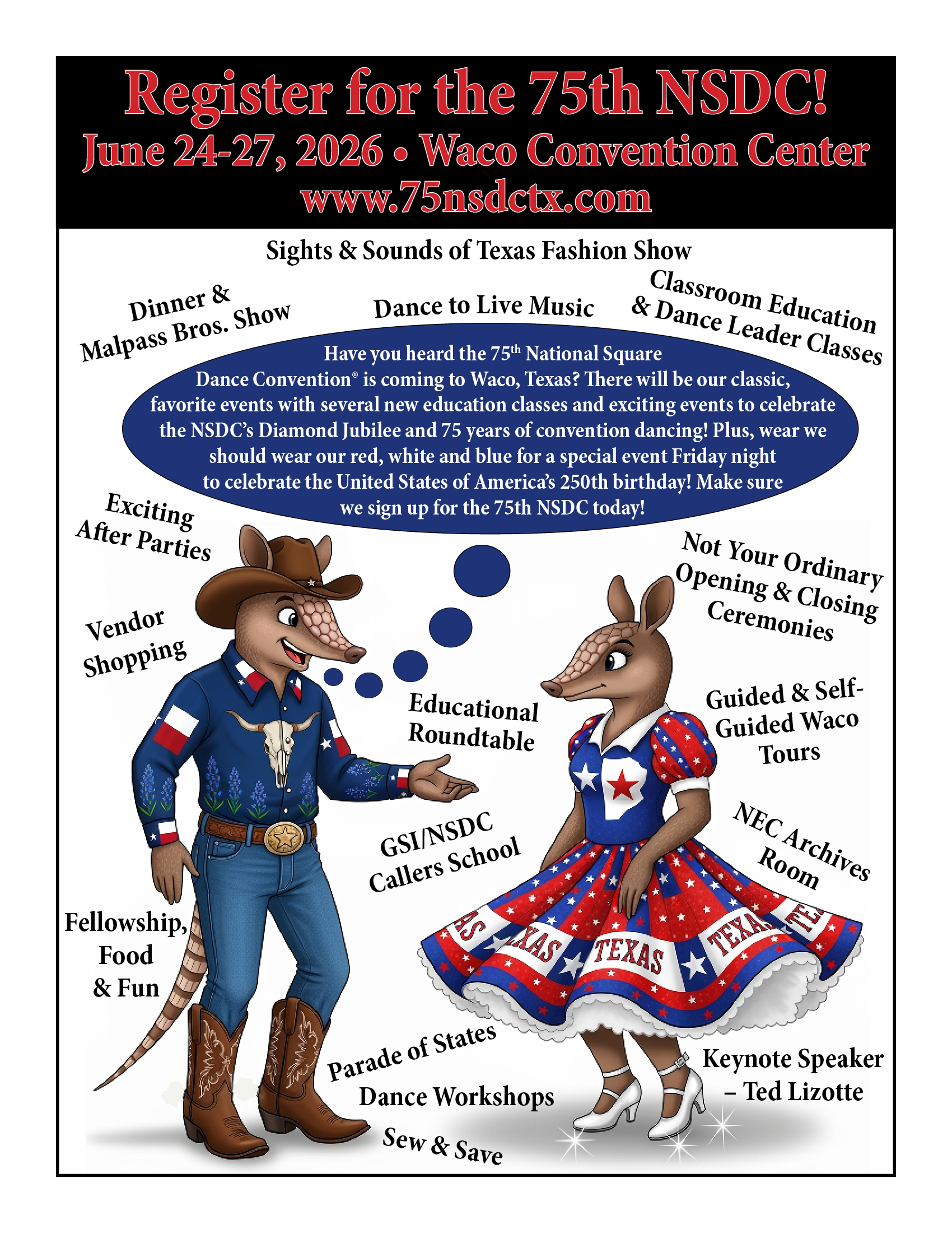 Links to Flyers 250 Celebration jpegDownload 250 Celebration pdfDownload Education Classes Potpourri FlyerDownload Education Classes Potpourri Flyer pdfDownload Finding Convention InformationDownload Finding Convention Information pdfDownload Hotels Pet Friendly Update 01.15.26Download Hotels Pet Friendly Update 01.15.26 pdfDownload Hotels Update 01.15.26Download Hotels Update 01.15.26 pdfDownload Pot of Gold Convention FlyerDownload Pot of Gold Convention Flyer pdfDownload Sew and Save ClassesDownload Sew and Save Classes pdfDownload Valentine Gift FlyerDownload Valentine Gift Flyer pdfDownload Bolos & Showcase FlyerDownload Bolos & Showcase Flyer pdfDownload Celebrating Our Vendors FlyerDownload Celebrating Our Vendors Flyer pdfDownload Christmas Gift of Dance FlyerDownload Christmas Gift of Dance Flyer pdfDownload Education Classes Publicity & PromotionDownload Education Classes Publicity & Promotion pdfDownload Finalize Camping Reservations FlyerDownload Finalize Camping Reservations Flyer pdfDownload Ghost Riders Go Fund MeDownload Ghost Riders Go Fund Me pdfDownload NEC Archive Room Texas ConnectionDownload NEC Archive Room Texas Connection pdfDownload Trash DancingDownload Trash Dancing pdfDownload What to Do Flyer pdfDownload What to Do FlyerDownload Your First National Convention FlyerDownload Your First National Convention Flyer pdfDownload Convention Center FacilitiesDownload Convention Center Facilities pdfDownload Dance Leader Profile UpdateDownload Dance Leader Profile Update pdfDownload Volunteer Descriptions We Want YOUDownload Volunteer Descriptions We Want YOUDownload Fashion ShowDownload Fashion Show pdfDownload 75th Chicken adDownload 75th Chicken ad vpdfDownload Looking for Dance Leaders revisedDownload Looking for Dance Leaders revisedDownload Get your dance on flyerDownload Get your dance on flyer pdfDownload Getting to the 75th National Square Dance ConventionDownload Getting to the 75th National Square Dance Convention pdfDownload Ghost Riders GoFundMe infoDownload Ghost Riders GoFundMe info pdfDownload Ghost Riders Go Fund Me jpgDownload Ghost Riders Go Fund Me pdfDownload Hotels Revised 11.15.25Download Hotels Revised 11.15.25 pdfDownload Hotels Pet Friendly Revised 11.15.25Download Hotels Pet Friendly Revised 11.15.25 pdfDownload 75th Hotel UpdateDownload 75th Hotel Update pdfDownload 75 convention hotelsDownload 75 Convention HotelsDownload 75 Convention Hotels PetsDownload 75 Convention Hotels Pet FriendlyDownload 75th NSDC Hotel Booking PortalDownload 75th NSDC Hotel Booking Portal pdfDownload Camground FlyerDownload Camground Flyer pdfDownload Malpass-Brothers-Revised July 2025Download Malpass-Brothers-Revised July 2025Download Roundtable Panelists pg1Download Roundtable Panelists pg1 pdfDownload Roundtable Panelists pg2Download Roundtable Panelists pg2 pdfDownload Searching for InfoDownload Searching for Info pdfDownload Sights and Sounds FlyerDownload Sights and Sounds Flyer pdfDownload Tour Brochure pdfDownload Tour Brochure-1_Page_1Download Tour Brochure-1_Page_2Download self guided tours Waco Final_Page_1Download self guided tours Waco Final_Page_2Download self guided tours Waco Final_Page_3Download Self guided Tours WacoDownload Benefits of Volunteering jpegDownload Benefits of Volunteering pdfDownload Convention Autumn Generic Flyer jpegDownload Convention Autumn Generic Flyer pdfDownload Keynote Speaker Ted Lizotte jpegDownload Keynote Speaker Ted Lizotte pdfDownload Leadership Certification Program jpegDownload Leadership Certification Program pdfDownload Looking for Dance Leaders jpegDownload Looking for Dance Leaders pdfDownload Organizational Roundtable Pink jpegDownload Organizational Roundtable Pink pdfDownload Organizational Roundtable Vibrant jpegDownload Organizational Roundtable Vibrant pdfDownload Visit the silos jpegDownload Visit the silos pdfDownload Volunteer Descriptions We Want You jpegDownload Volunteer Descriptions We Want You pdfDownload Wear Red, White & Blue Flyer2 jpegDownload Wear Red, White & Blue Flyer2 pdfDownload What Waco CC Offers jpegDownload What Waco CC Offers pdfDownload Youth Activities Flyer jpegDownload Youth Activities Flyer pdfDownload Convention_App_Announcement[1]Download Education_Dancer_Leadership_Classes[1]Download Education Dancer Leadership Classes pdfDownload Ghost_Riders_Go_Fund_Me[1]Download Ghost Riders Go Fund Me pdfDownload LCP_Diamonds_in_Your_Bag_Flyer[1]Download LCP Diamonds in Your Bag Flyer pdfDownload Longhorn_Are_You_Registered[1]Download Longhorn Are You Registered pdfDownload Looking_for_Callers_rev_10.15.25[1]Download Looking for Callers rev 10.15.25 pdfDownload National_Square_Dance_Day[1]Download National Square Dance Day pdfDownload Reasons_to_Attend_Convention_Flyer[1]Download Reasons to Attend Convention Flyer pdfDownload Waco_Dining_Guide_Flyer[1]Download Waco Dining Guide Flyer pdfDownload 75NSDC Diamond Jubilee 2025 flyerDownload Diamond Jubilee Flyer pdfDownload