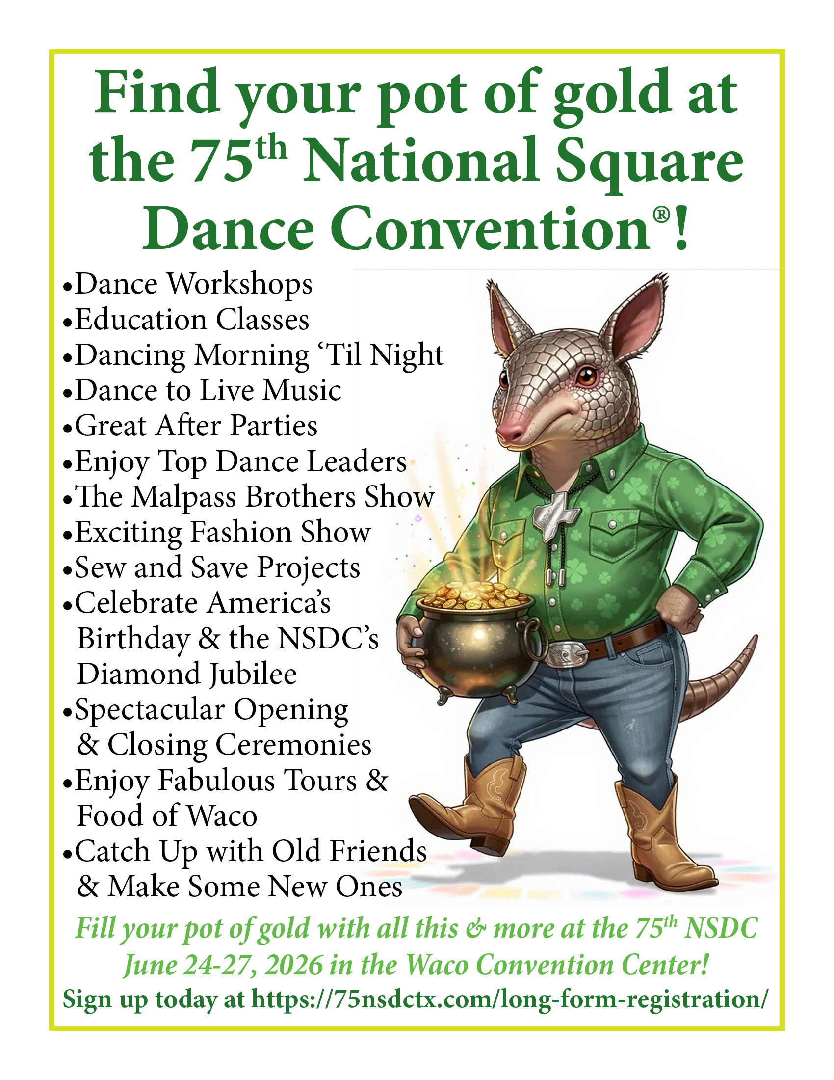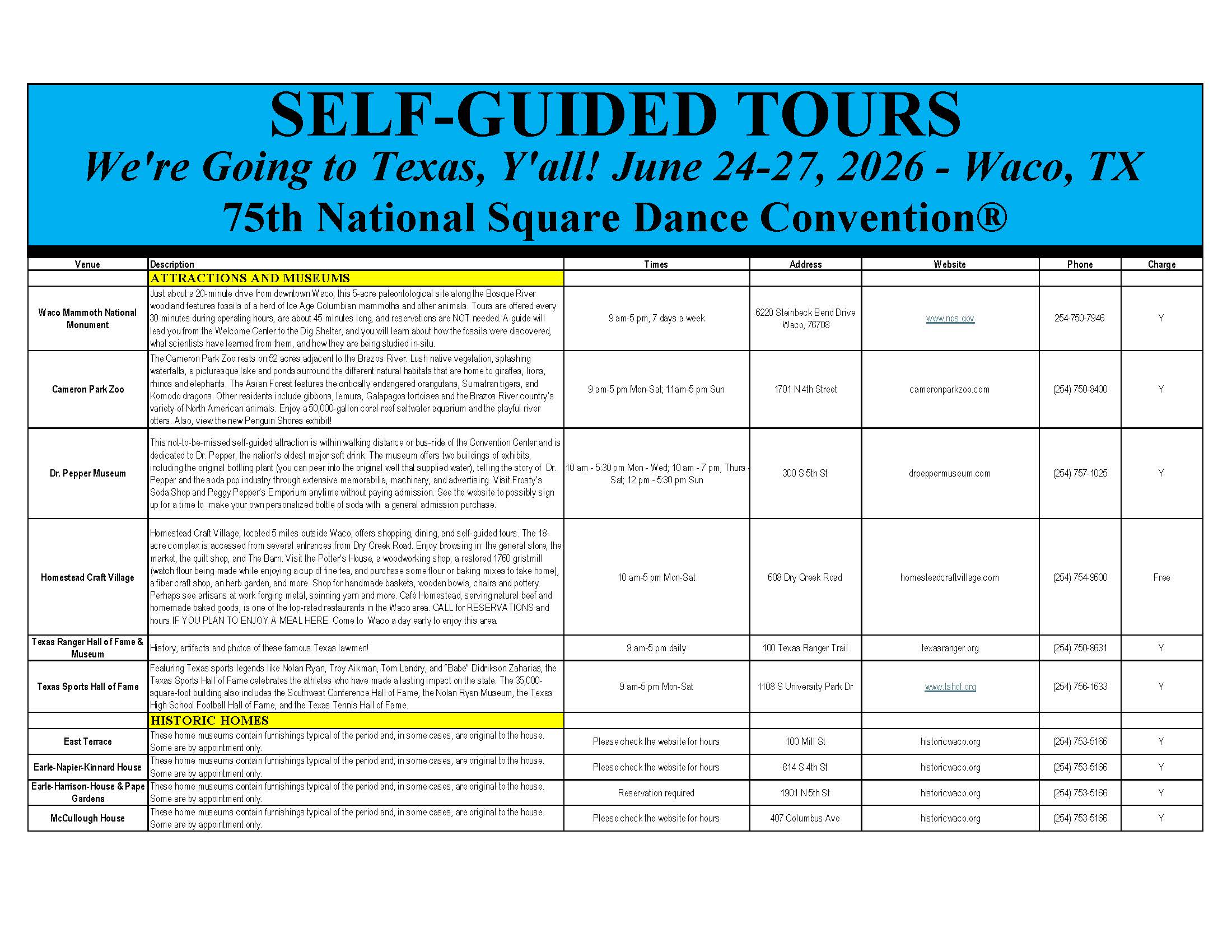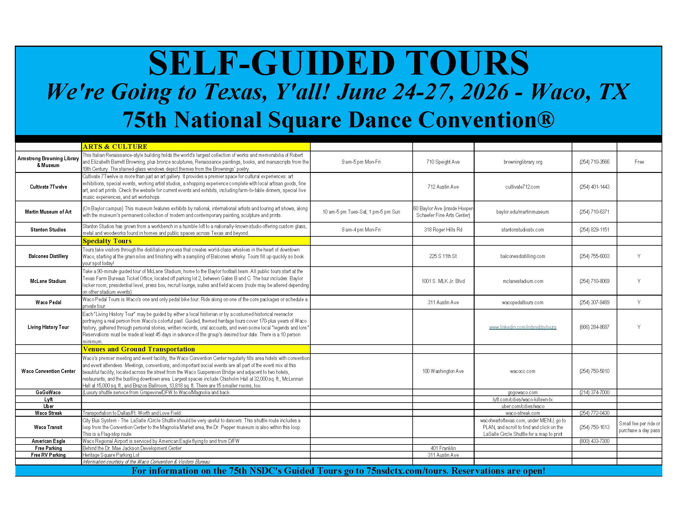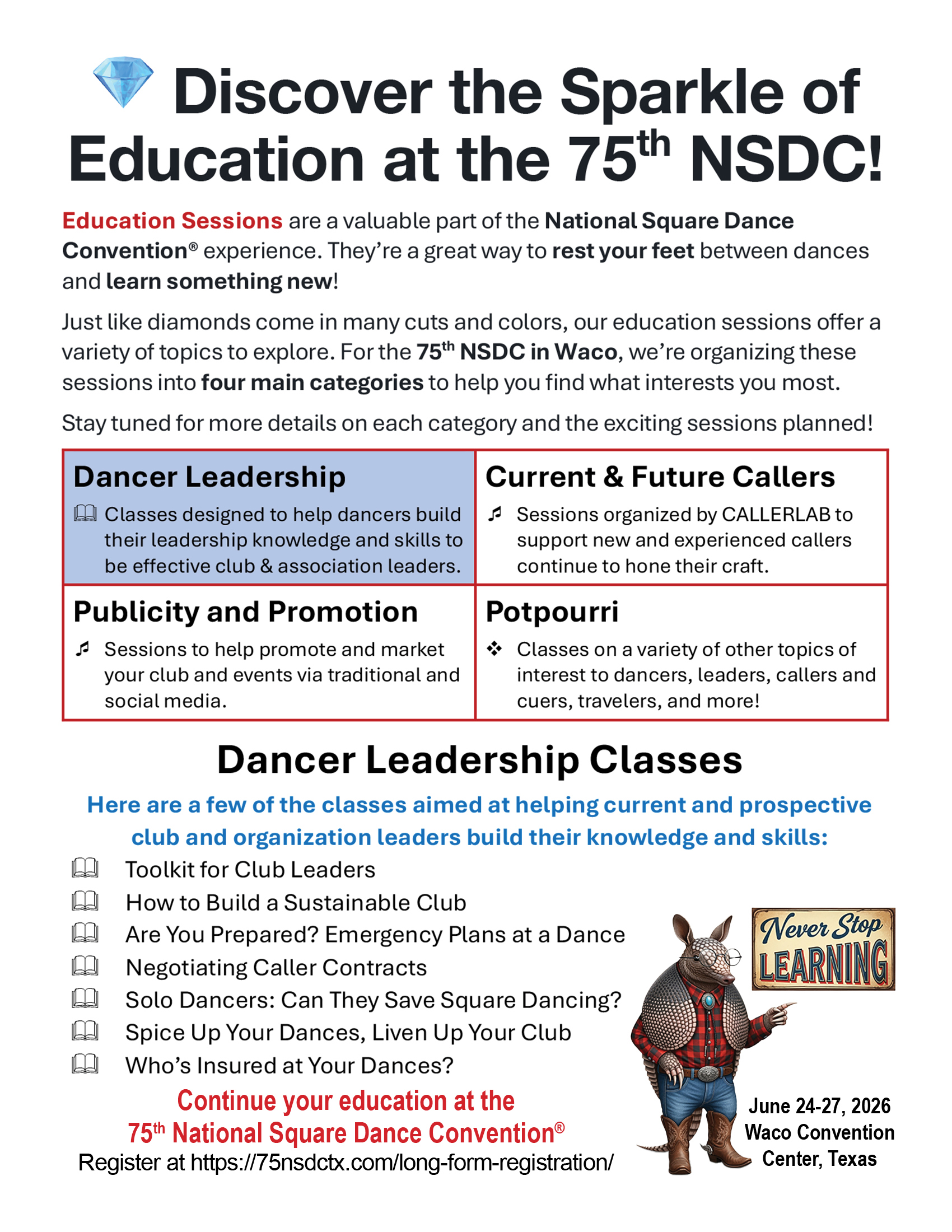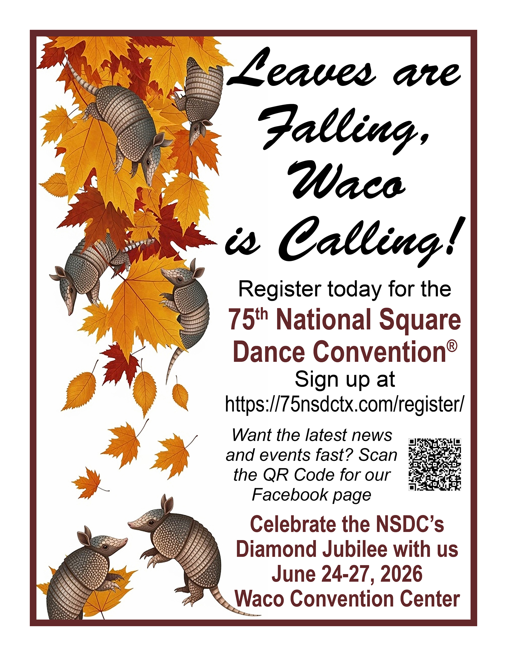 Links to Flyers 250 Celebration jpegDownload 250 Celebration pdfDownload Education Classes Potpourri FlyerDownload Education Classes Potpourri Flyer pdfDownload Finding Convention InformationDownload Finding Convention Information pdfDownload Hotels Pet Friendly Update 01.15.26Download Hotels Pet Friendly Update 01.15.26 pdfDownload Hotels Update 01.15.26Download Hotels Update 01.15.26 pdfDownload Pot of Gold Convention FlyerDownload Pot of Gold Convention Flyer pdfDownload Sew and Save ClassesDownload Sew and Save Classes pdfDownload Valentine Gift FlyerDownload Valentine Gift Flyer pdfDownload Bolos & Showcase FlyerDownload Bolos & Showcase Flyer pdfDownload Celebrating Our Vendors FlyerDownload Celebrating Our Vendors Flyer pdfDownload Christmas Gift of Dance FlyerDownload Christmas Gift of Dance Flyer pdfDownload Education Classes Publicity & PromotionDownload Education Classes Publicity & Promotion pdfDownload Finalize Camping Reservations FlyerDownload Finalize Camping Reservations Flyer pdfDownload Ghost Riders Go Fund MeDownload Ghost Riders Go Fund Me pdfDownload NEC Archive Room Texas ConnectionDownload NEC Archive Room Texas Connection pdfDownload Trash DancingDownload Trash Dancing pdfDownload What to Do Flyer pdfDownload What to Do FlyerDownload Your First National Convention FlyerDownload Your First National Convention Flyer pdfDownload Convention Center FacilitiesDownload Convention Center Facilities pdfDownload Dance Leader Profile UpdateDownload Dance Leader Profile Update pdfDownload Volunteer Descriptions We Want YOUDownload Volunteer Descriptions We Want YOUDownload Fashion ShowDownload Fashion Show pdfDownload 75th Chicken adDownload 75th Chicken ad vpdfDownload Looking for Dance Leaders revisedDownload Looking for Dance Leaders revisedDownload Get your dance on flyerDownload Get your dance on flyer pdfDownload Getting to the 75th National Square Dance ConventionDownload Getting to the 75th National Square Dance Convention pdfDownload Ghost Riders GoFundMe infoDownload Ghost Riders GoFundMe info pdfDownload Ghost Riders Go Fund Me jpgDownload Ghost Riders Go Fund Me pdfDownload Hotels Revised 11.15.25Download Hotels Revised 11.15.25 pdfDownload Hotels Pet Friendly Revised 11.15.25Download Hotels Pet Friendly Revised 11.15.25 pdfDownload 75th Hotel UpdateDownload 75th Hotel Update pdfDownload 75 convention hotelsDownload 75 Convention HotelsDownload 75 Convention Hotels PetsDownload 75 Convention Hotels Pet FriendlyDownload 75th NSDC Hotel Booking PortalDownload 75th NSDC Hotel Booking Portal pdfDownload Camground FlyerDownload Camground Flyer pdfDownload Malpass-Brothers-Revised July 2025Download Malpass-Brothers-Revised July 2025Download Roundtable Panelists pg1Download Roundtable Panelists pg1 pdfDownload Roundtable Panelists pg2Download Roundtable Panelists pg2 pdfDownload Searching for InfoDownload Searching for Info pdfDownload Sights and Sounds FlyerDownload Sights and Sounds Flyer pdfDownload Tour Brochure pdfDownload Tour Brochure-1_Page_1Download Tour Brochure-1_Page_2Download self guided tours Waco Final_Page_1Download self guided tours Waco Final_Page_2Download self guided tours Waco Final_Page_3Download Self guided Tours WacoDownload Benefits of Volunteering jpegDownload Benefits of Volunteering pdfDownload Convention Autumn Generic Flyer jpegDownload Convention Autumn Generic Flyer pdfDownload Keynote Speaker Ted Lizotte jpegDownload Keynote Speaker Ted Lizotte pdfDownload Leadership Certification Program jpegDownload Leadership Certification Program pdfDownload Looking for Dance Leaders jpegDownload Looking for Dance Leaders pdfDownload Organizational Roundtable Pink jpegDownload Organizational Roundtable Pink pdfDownload Organizational Roundtable Vibrant jpegDownload Organizational Roundtable Vibrant pdfDownload Visit the silos jpegDownload Visit the silos pdfDownload Volunteer Descriptions We Want You jpegDownload Volunteer Descriptions We Want You pdfDownload Wear Red, White & Blue Flyer2 jpegDownload Wear Red, White & Blue Flyer2 pdfDownload What Waco CC Offers jpegDownload What Waco CC Offers pdfDownload Youth Activities Flyer jpegDownload Youth Activities Flyer pdfDownload Convention_App_Announcement[1]Download Education_Dancer_Leadership_Classes[1]Download Education Dancer Leadership Classes pdfDownload Ghost_Riders_Go_Fund_Me[1]Download Ghost Riders Go Fund Me pdfDownload LCP_Diamonds_in_Your_Bag_Flyer[1]Download LCP Diamonds in Your Bag Flyer pdfDownload Longhorn_Are_You_Registered[1]Download Longhorn Are You Registered pdfDownload Looking_for_Callers_rev_10.15.25[1]Download Looking for Callers rev 10.15.25 pdfDownload National_Square_Dance_Day[1]Download National Square Dance Day pdfDownload Reasons_to_Attend_Convention_Flyer[1]Download Reasons to Attend Convention Flyer pdfDownload Waco_Dining_Guide_Flyer[1]Download Waco Dining Guide Flyer pdfDownload 75NSDC Diamond Jubilee 2025 flyerDownload Diamond Jubilee Flyer pdfDownload