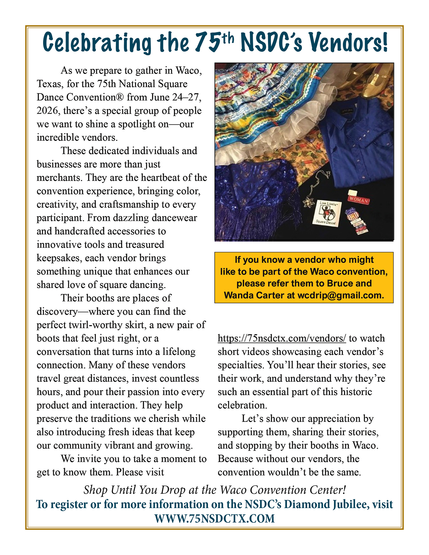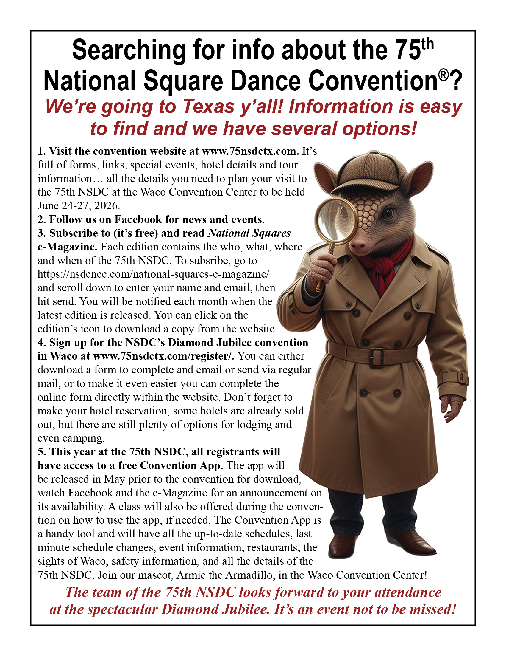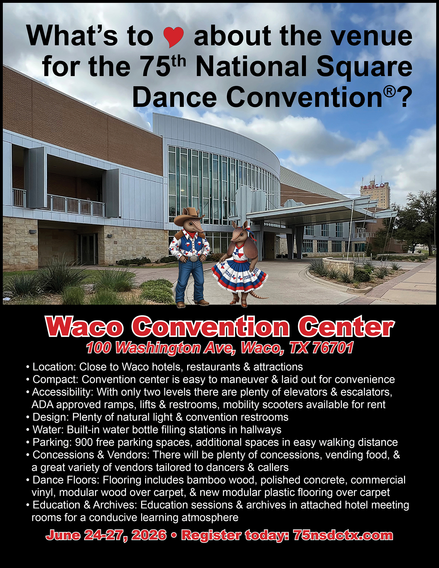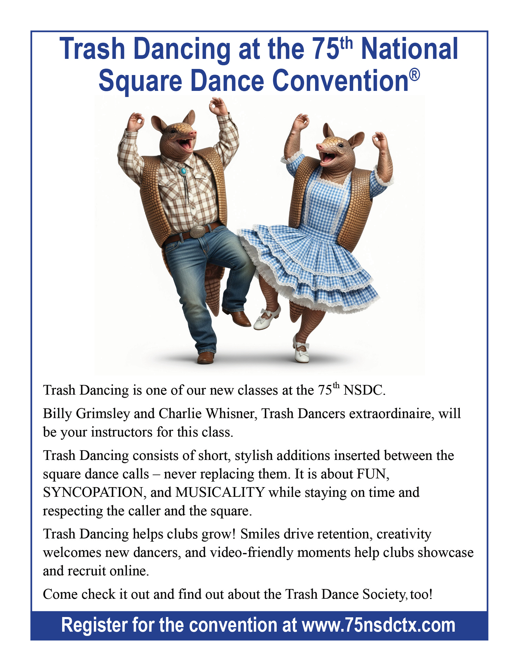 Links to Flyers 250 Celebration jpegDownload 250 Celebration pdfDownload Education Classes Potpourri FlyerDownload Education Classes Potpourri Flyer pdfDownload Finding Convention InformationDownload Finding Convention Information pdfDownload Hotels Pet Friendly Update 01.15.26Download Hotels Pet Friendly Update 01.15.26 pdfDownload Hotels Update 01.15.26Download Hotels Update 01.15.26 pdfDownload Pot of Gold Convention FlyerDownload Pot of Gold Convention Flyer pdfDownload Sew and Save ClassesDownload Sew and Save Classes pdfDownload Valentine Gift FlyerDownload Valentine Gift Flyer pdfDownload Bolos & Showcase FlyerDownload Bolos & Showcase Flyer pdfDownload Celebrating Our Vendors FlyerDownload Celebrating Our Vendors Flyer pdfDownload Christmas Gift of Dance FlyerDownload Christmas Gift of Dance Flyer pdfDownload Education Classes Publicity & PromotionDownload Education Classes Publicity & Promotion pdfDownload Finalize Camping Reservations FlyerDownload Finalize Camping Reservations Flyer pdfDownload Ghost Riders Go Fund MeDownload Ghost Riders Go Fund Me pdfDownload NEC Archive Room Texas ConnectionDownload NEC Archive Room Texas Connection pdfDownload Trash DancingDownload Trash Dancing pdfDownload What to Do Flyer pdfDownload What to Do FlyerDownload Your First National Convention FlyerDownload Your First National Convention Flyer pdfDownload Convention Center FacilitiesDownload Convention Center Facilities pdfDownload Dance Leader Profile UpdateDownload Dance Leader Profile Update pdfDownload Volunteer Descriptions We Want YOUDownload Volunteer Descriptions We Want YOUDownload Fashion ShowDownload Fashion Show pdfDownload 75th Chicken adDownload 75th Chicken ad vpdfDownload Looking for Dance Leaders revisedDownload Looking for Dance Leaders revisedDownload Get your dance on flyerDownload Get your dance on flyer pdfDownload Getting to the 75th National Square Dance ConventionDownload Getting to the 75th National Square Dance Convention pdfDownload Ghost Riders GoFundMe infoDownload Ghost Riders GoFundMe info pdfDownload Ghost Riders Go Fund Me jpgDownload Ghost Riders Go Fund Me pdfDownload Hotels Revised 11.15.25Download Hotels Revised 11.15.25 pdfDownload Hotels Pet Friendly Revised 11.15.25Download Hotels Pet Friendly Revised 11.15.25 pdfDownload 75th Hotel UpdateDownload 75th Hotel Update pdfDownload 75 convention hotelsDownload 75 Convention HotelsDownload 75 Convention Hotels PetsDownload 75 Convention Hotels Pet FriendlyDownload 75th NSDC Hotel Booking PortalDownload 75th NSDC Hotel Booking Portal pdfDownload Camground FlyerDownload Camground Flyer pdfDownload Malpass-Brothers-Revised July 2025Download Malpass-Brothers-Revised July 2025Download Roundtable Panelists pg1Download Roundtable Panelists pg1 pdfDownload Roundtable Panelists pg2Download Roundtable Panelists pg2 pdfDownload Searching for InfoDownload Searching for Info pdfDownload Sights and Sounds FlyerDownload Sights and Sounds Flyer pdfDownload Tour Brochure pdfDownload Tour Brochure-1_Page_1Download Tour Brochure-1_Page_2Download self guided tours Waco Final_Page_1Download self guided tours Waco Final_Page_2Download self guided tours Waco Final_Page_3Download Self guided Tours WacoDownload Benefits of Volunteering jpegDownload Benefits of Volunteering pdfDownload Convention Autumn Generic Flyer jpegDownload Convention Autumn Generic Flyer pdfDownload Keynote Speaker Ted Lizotte jpegDownload Keynote Speaker Ted Lizotte pdfDownload Leadership Certification Program jpegDownload Leadership Certification Program pdfDownload Looking for Dance Leaders jpegDownload Looking for Dance Leaders pdfDownload Organizational Roundtable Pink jpegDownload Organizational Roundtable Pink pdfDownload Organizational Roundtable Vibrant jpegDownload Organizational Roundtable Vibrant pdfDownload Visit the silos jpegDownload Visit the silos pdfDownload Volunteer Descriptions We Want You jpegDownload Volunteer Descriptions We Want You pdfDownload Wear Red, White & Blue Flyer2 jpegDownload Wear Red, White & Blue Flyer2 pdfDownload What Waco CC Offers jpegDownload What Waco CC Offers pdfDownload Youth Activities Flyer jpegDownload Youth Activities Flyer pdfDownload Convention_App_Announcement[1]Download Education_Dancer_Leadership_Classes[1]Download Education Dancer Leadership Classes pdfDownload Ghost_Riders_Go_Fund_Me[1]Download Ghost Riders Go Fund Me pdfDownload LCP_Diamonds_in_Your_Bag_Flyer[1]Download LCP Diamonds in Your Bag Flyer pdfDownload Longhorn_Are_You_Registered[1]Download Longhorn Are You Registered pdfDownload Looking_for_Callers_rev_10.15.25[1]Download Looking for Callers rev 10.15.25 pdfDownload National_Square_Dance_Day[1]Download National Square Dance Day pdfDownload Reasons_to_Attend_Convention_Flyer[1]Download Reasons to Attend Convention Flyer pdfDownload Waco_Dining_Guide_Flyer[1]Download Waco Dining Guide Flyer pdfDownload 75NSDC Diamond Jubilee 2025 flyerDownload Diamond Jubilee Flyer pdfDownload