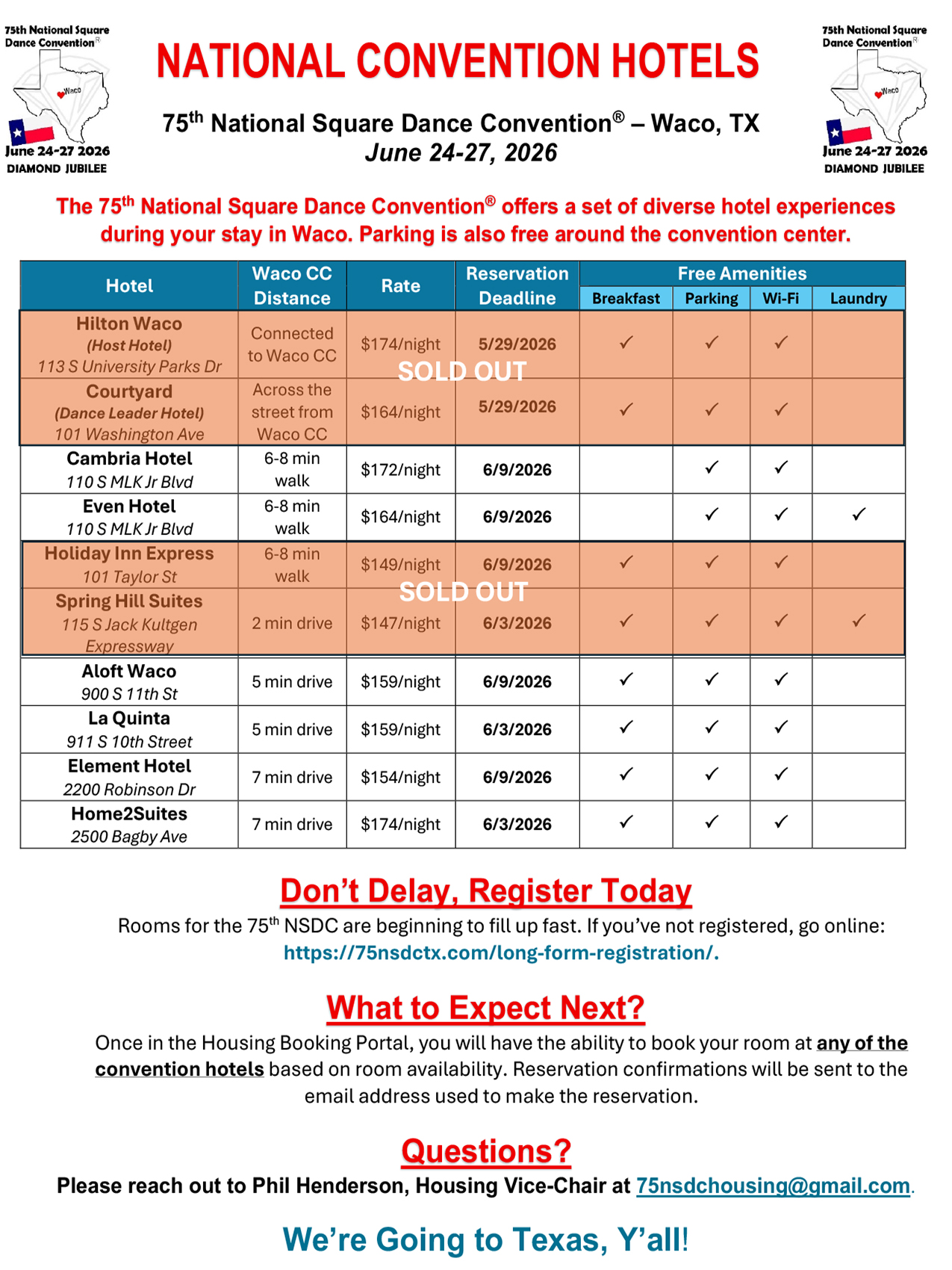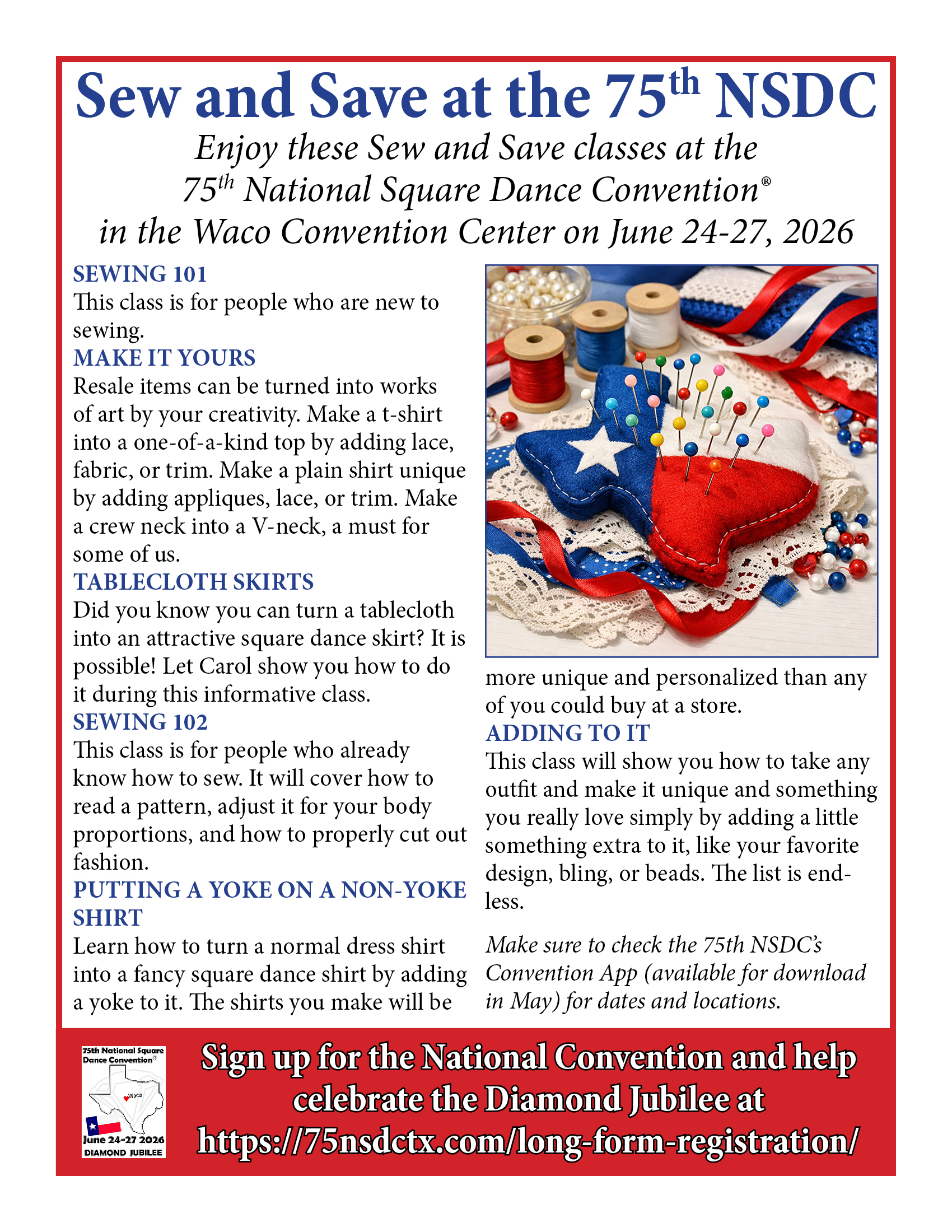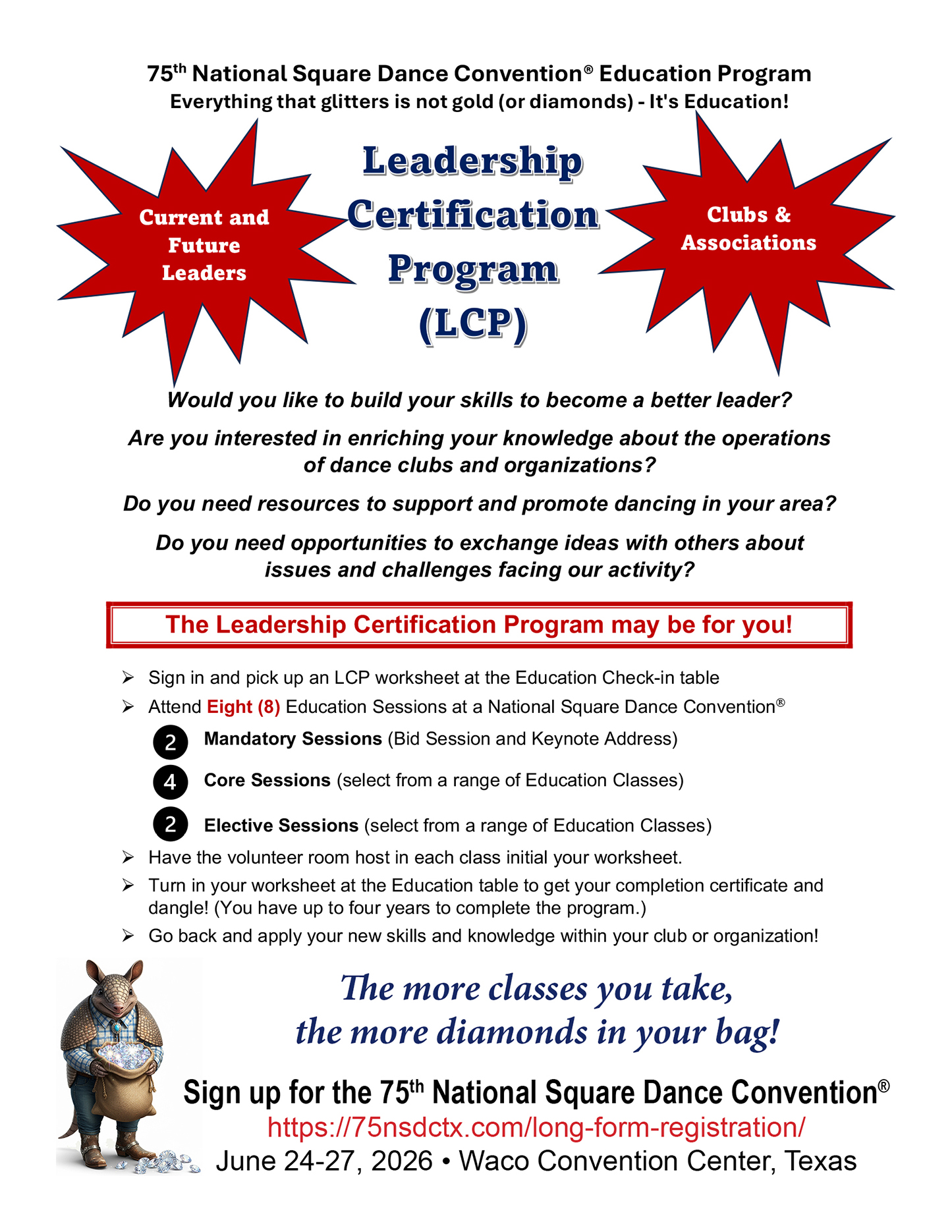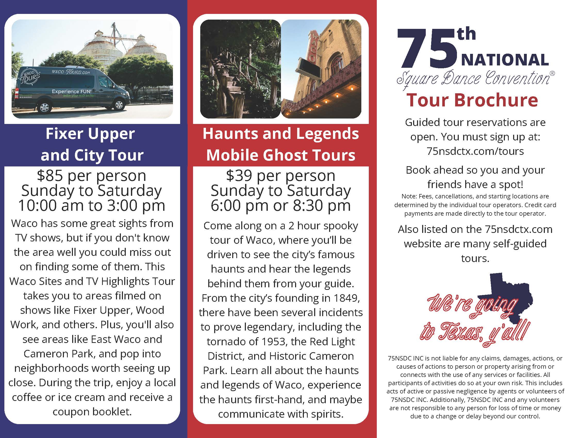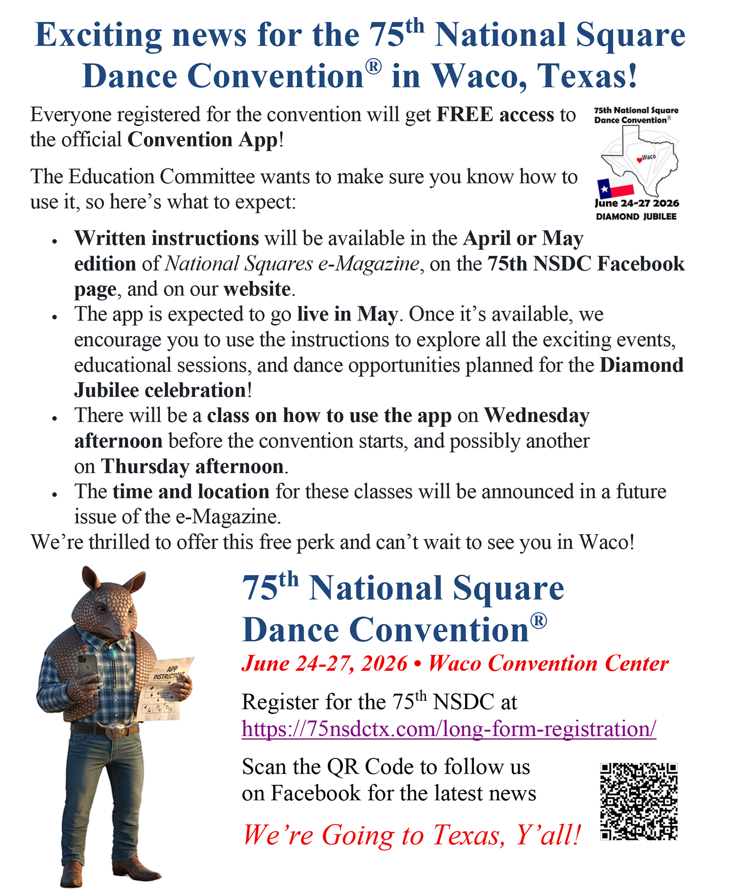 Links to Flyers 250 Celebration jpegDownload 250 Celebration pdfDownload Education Classes Potpourri FlyerDownload Education Classes Potpourri Flyer pdfDownload Finding Convention InformationDownload Finding Convention Information pdfDownload Hotels Pet Friendly Update 01.15.26Download Hotels Pet Friendly Update 01.15.26 pdfDownload Hotels Update 01.15.26Download Hotels Update 01.15.26 pdfDownload Pot of Gold Convention FlyerDownload Pot of Gold Convention Flyer pdfDownload Sew and Save ClassesDownload Sew and Save Classes pdfDownload Valentine Gift FlyerDownload Valentine Gift Flyer pdfDownload Bolos & Showcase FlyerDownload Bolos & Showcase Flyer pdfDownload Celebrating Our Vendors FlyerDownload Celebrating Our Vendors Flyer pdfDownload Christmas Gift of Dance FlyerDownload Christmas Gift of Dance Flyer pdfDownload Education Classes Publicity & PromotionDownload Education Classes Publicity & Promotion pdfDownload Finalize Camping Reservations FlyerDownload Finalize Camping Reservations Flyer pdfDownload Ghost Riders Go Fund MeDownload Ghost Riders Go Fund Me pdfDownload NEC Archive Room Texas ConnectionDownload NEC Archive Room Texas Connection pdfDownload Trash DancingDownload Trash Dancing pdfDownload What to Do Flyer pdfDownload What to Do FlyerDownload Your First National Convention FlyerDownload Your First National Convention Flyer pdfDownload Convention Center FacilitiesDownload Convention Center Facilities pdfDownload Dance Leader Profile UpdateDownload Dance Leader Profile Update pdfDownload Volunteer Descriptions We Want YOUDownload Volunteer Descriptions We Want YOUDownload Fashion ShowDownload Fashion Show pdfDownload 75th Chicken adDownload 75th Chicken ad vpdfDownload Looking for Dance Leaders revisedDownload Looking for Dance Leaders revisedDownload Get your dance on flyerDownload Get your dance on flyer pdfDownload Getting to the 75th National Square Dance ConventionDownload Getting to the 75th National Square Dance Convention pdfDownload Ghost Riders GoFundMe infoDownload Ghost Riders GoFundMe info pdfDownload Ghost Riders Go Fund Me jpgDownload Ghost Riders Go Fund Me pdfDownload Hotels Revised 11.15.25Download Hotels Revised 11.15.25 pdfDownload Hotels Pet Friendly Revised 11.15.25Download Hotels Pet Friendly Revised 11.15.25 pdfDownload 75th Hotel UpdateDownload 75th Hotel Update pdfDownload 75 convention hotelsDownload 75 Convention HotelsDownload 75 Convention Hotels PetsDownload 75 Convention Hotels Pet FriendlyDownload 75th NSDC Hotel Booking PortalDownload 75th NSDC Hotel Booking Portal pdfDownload Camground FlyerDownload Camground Flyer pdfDownload Malpass-Brothers-Revised July 2025Download Malpass-Brothers-Revised July 2025Download Roundtable Panelists pg1Download Roundtable Panelists pg1 pdfDownload Roundtable Panelists pg2Download Roundtable Panelists pg2 pdfDownload Searching for InfoDownload Searching for Info pdfDownload Sights and Sounds FlyerDownload Sights and Sounds Flyer pdfDownload Tour Brochure pdfDownload Tour Brochure-1_Page_1Download Tour Brochure-1_Page_2Download self guided tours Waco Final_Page_1Download self guided tours Waco Final_Page_2Download self guided tours Waco Final_Page_3Download Self guided Tours WacoDownload Benefits of Volunteering jpegDownload Benefits of Volunteering pdfDownload Convention Autumn Generic Flyer jpegDownload Convention Autumn Generic Flyer pdfDownload Keynote Speaker Ted Lizotte jpegDownload Keynote Speaker Ted Lizotte pdfDownload Leadership Certification Program jpegDownload Leadership Certification Program pdfDownload Looking for Dance Leaders jpegDownload Looking for Dance Leaders pdfDownload Organizational Roundtable Pink jpegDownload Organizational Roundtable Pink pdfDownload Organizational Roundtable Vibrant jpegDownload Organizational Roundtable Vibrant pdfDownload Visit the silos jpegDownload Visit the silos pdfDownload Volunteer Descriptions We Want You jpegDownload Volunteer Descriptions We Want You pdfDownload Wear Red, White & Blue Flyer2 jpegDownload Wear Red, White & Blue Flyer2 pdfDownload What Waco CC Offers jpegDownload What Waco CC Offers pdfDownload Youth Activities Flyer jpegDownload Youth Activities Flyer pdfDownload Convention_App_Announcement[1]Download Education_Dancer_Leadership_Classes[1]Download Education Dancer Leadership Classes pdfDownload Ghost_Riders_Go_Fund_Me[1]Download Ghost Riders Go Fund Me pdfDownload LCP_Diamonds_in_Your_Bag_Flyer[1]Download LCP Diamonds in Your Bag Flyer pdfDownload Longhorn_Are_You_Registered[1]Download Longhorn Are You Registered pdfDownload Looking_for_Callers_rev_10.15.25[1]Download Looking for Callers rev 10.15.25 pdfDownload National_Square_Dance_Day[1]Download National Square Dance Day pdfDownload Reasons_to_Attend_Convention_Flyer[1]Download Reasons to Attend Convention Flyer pdfDownload Waco_Dining_Guide_Flyer[1]Download Waco Dining Guide Flyer pdfDownload 75NSDC Diamond Jubilee 2025 flyerDownload Diamond Jubilee Flyer pdfDownload