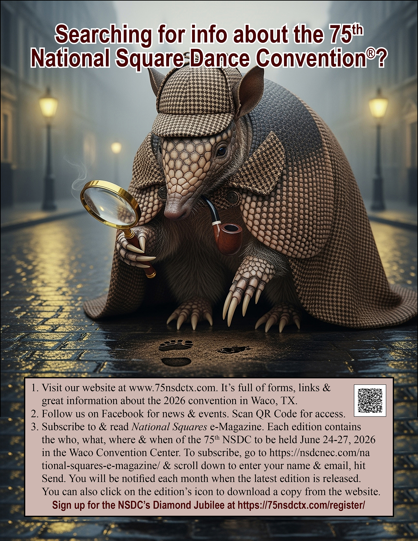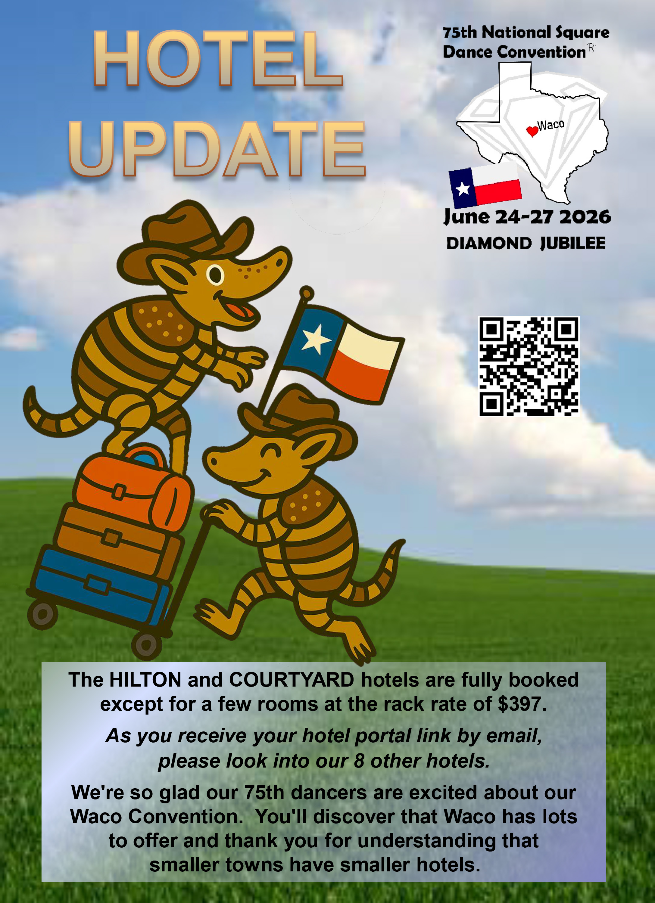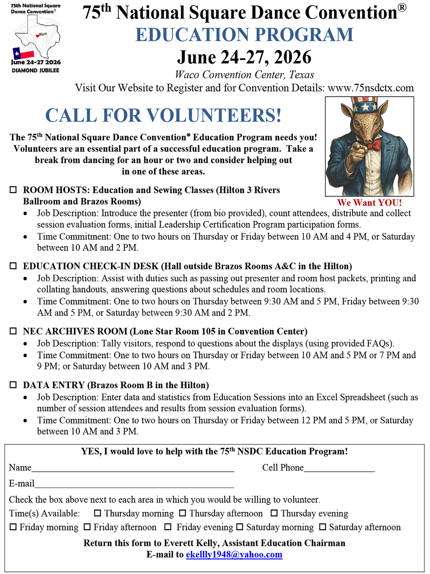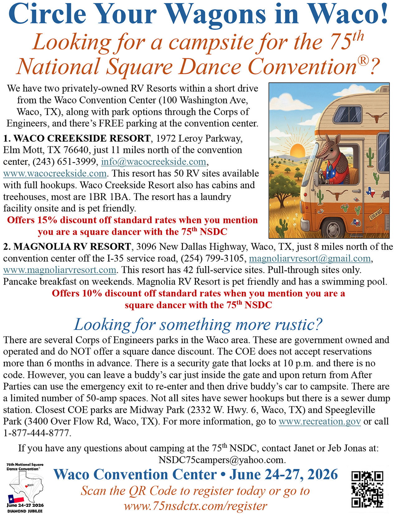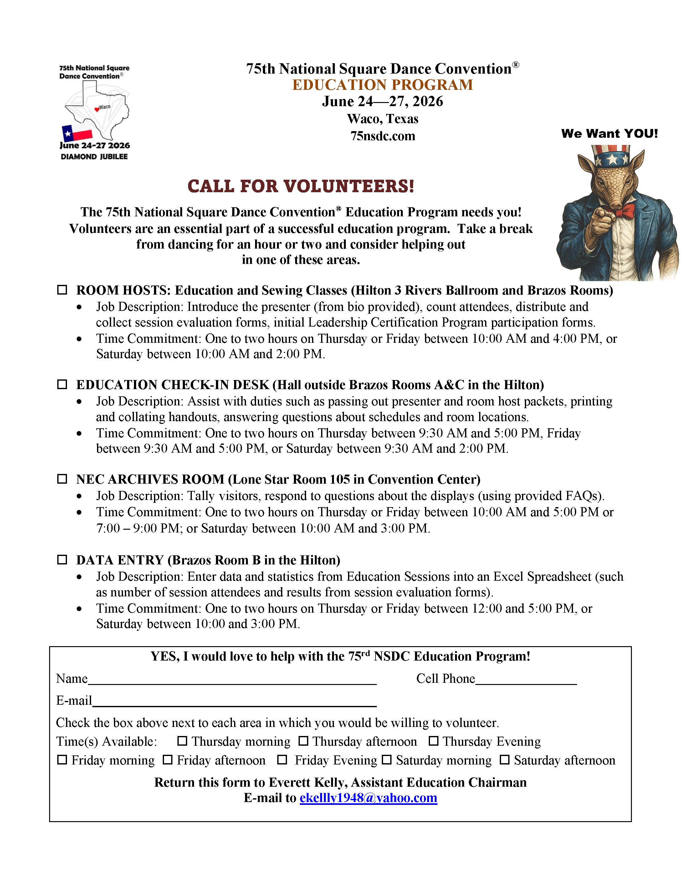 Links to Flyers 250 Celebration jpegDownload 250 Celebration pdfDownload Education Classes Potpourri FlyerDownload Education Classes Potpourri Flyer pdfDownload Finding Convention InformationDownload Finding Convention Information pdfDownload Hotels Pet Friendly Update 01.15.26Download Hotels Pet Friendly Update 01.15.26 pdfDownload Hotels Update 01.15.26Download Hotels Update 01.15.26 pdfDownload Pot of Gold Convention FlyerDownload Pot of Gold Convention Flyer pdfDownload Sew and Save ClassesDownload Sew and Save Classes pdfDownload Valentine Gift FlyerDownload Valentine Gift Flyer pdfDownload Bolos & Showcase FlyerDownload Bolos & Showcase Flyer pdfDownload Celebrating Our Vendors FlyerDownload Celebrating Our Vendors Flyer pdfDownload Christmas Gift of Dance FlyerDownload Christmas Gift of Dance Flyer pdfDownload Education Classes Publicity & PromotionDownload Education Classes Publicity & Promotion pdfDownload Finalize Camping Reservations FlyerDownload Finalize Camping Reservations Flyer pdfDownload Ghost Riders Go Fund MeDownload Ghost Riders Go Fund Me pdfDownload NEC Archive Room Texas ConnectionDownload NEC Archive Room Texas Connection pdfDownload Trash DancingDownload Trash Dancing pdfDownload What to Do Flyer pdfDownload What to Do FlyerDownload Your First National Convention FlyerDownload Your First National Convention Flyer pdfDownload Convention Center FacilitiesDownload Convention Center Facilities pdfDownload Dance Leader Profile UpdateDownload Dance Leader Profile Update pdfDownload Volunteer Descriptions We Want YOUDownload Volunteer Descriptions We Want YOUDownload Fashion ShowDownload Fashion Show pdfDownload 75th Chicken adDownload 75th Chicken ad vpdfDownload Looking for Dance Leaders revisedDownload Looking for Dance Leaders revisedDownload Get your dance on flyerDownload Get your dance on flyer pdfDownload Getting to the 75th National Square Dance ConventionDownload Getting to the 75th National Square Dance Convention pdfDownload Ghost Riders GoFundMe infoDownload Ghost Riders GoFundMe info pdfDownload Ghost Riders Go Fund Me jpgDownload Ghost Riders Go Fund Me pdfDownload Hotels Revised 11.15.25Download Hotels Revised 11.15.25 pdfDownload Hotels Pet Friendly Revised 11.15.25Download Hotels Pet Friendly Revised 11.15.25 pdfDownload 75th Hotel UpdateDownload 75th Hotel Update pdfDownload 75 convention hotelsDownload 75 Convention HotelsDownload 75 Convention Hotels PetsDownload 75 Convention Hotels Pet FriendlyDownload 75th NSDC Hotel Booking PortalDownload 75th NSDC Hotel Booking Portal pdfDownload Camground FlyerDownload Camground Flyer pdfDownload Malpass-Brothers-Revised July 2025Download Malpass-Brothers-Revised July 2025Download Roundtable Panelists pg1Download Roundtable Panelists pg1 pdfDownload Roundtable Panelists pg2Download Roundtable Panelists pg2 pdfDownload Searching for InfoDownload Searching for Info pdfDownload Sights and Sounds FlyerDownload Sights and Sounds Flyer pdfDownload Tour Brochure pdfDownload Tour Brochure-1_Page_1Download Tour Brochure-1_Page_2Download self guided tours Waco Final_Page_1Download self guided tours Waco Final_Page_2Download self guided tours Waco Final_Page_3Download Self guided Tours WacoDownload Benefits of Volunteering jpegDownload Benefits of Volunteering pdfDownload Convention Autumn Generic Flyer jpegDownload Convention Autumn Generic Flyer pdfDownload Keynote Speaker Ted Lizotte jpegDownload Keynote Speaker Ted Lizotte pdfDownload Leadership Certification Program jpegDownload Leadership Certification Program pdfDownload Looking for Dance Leaders jpegDownload Looking for Dance Leaders pdfDownload Organizational Roundtable Pink jpegDownload Organizational Roundtable Pink pdfDownload Organizational Roundtable Vibrant jpegDownload Organizational Roundtable Vibrant pdfDownload Visit the silos jpegDownload Visit the silos pdfDownload Volunteer Descriptions We Want You jpegDownload Volunteer Descriptions We Want You pdfDownload Wear Red, White & Blue Flyer2 jpegDownload Wear Red, White & Blue Flyer2 pdfDownload What Waco CC Offers jpegDownload What Waco CC Offers pdfDownload Youth Activities Flyer jpegDownload Youth Activities Flyer pdfDownload Convention_App_Announcement[1]Download Education_Dancer_Leadership_Classes[1]Download Education Dancer Leadership Classes pdfDownload Ghost_Riders_Go_Fund_Me[1]Download Ghost Riders Go Fund Me pdfDownload LCP_Diamonds_in_Your_Bag_Flyer[1]Download LCP Diamonds in Your Bag Flyer pdfDownload Longhorn_Are_You_Registered[1]Download Longhorn Are You Registered pdfDownload Looking_for_Callers_rev_10.15.25[1]Download Looking for Callers rev 10.15.25 pdfDownload National_Square_Dance_Day[1]Download National Square Dance Day pdfDownload Reasons_to_Attend_Convention_Flyer[1]Download Reasons to Attend Convention Flyer pdfDownload Waco_Dining_Guide_Flyer[1]Download Waco Dining Guide Flyer pdfDownload 75NSDC Diamond Jubilee 2025 flyerDownload Diamond Jubilee Flyer pdfDownload