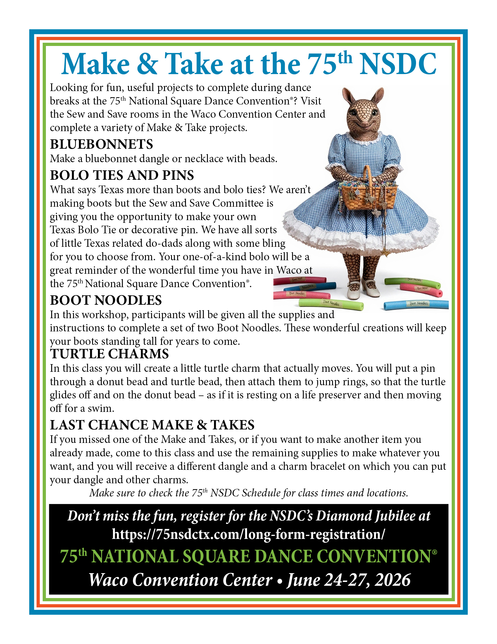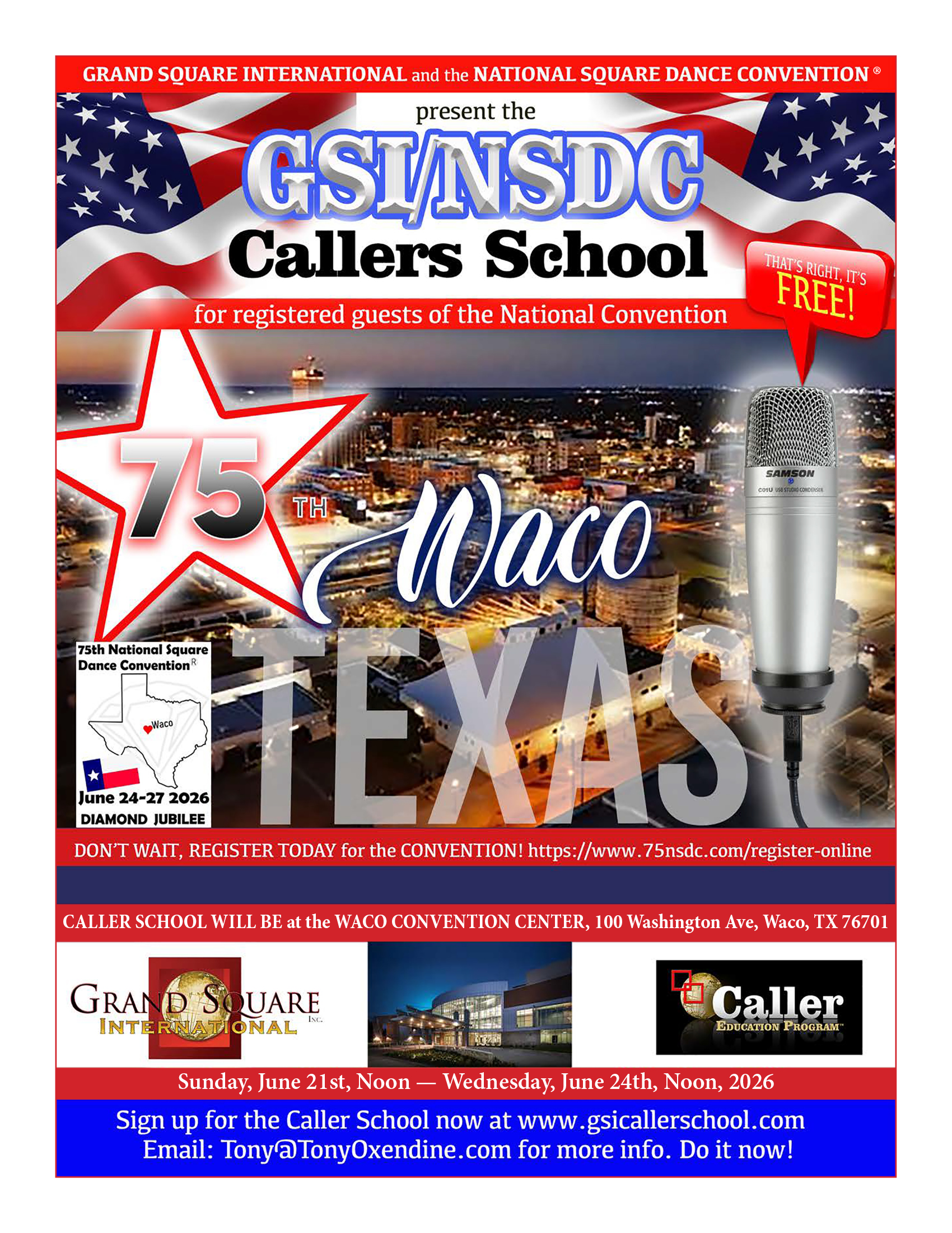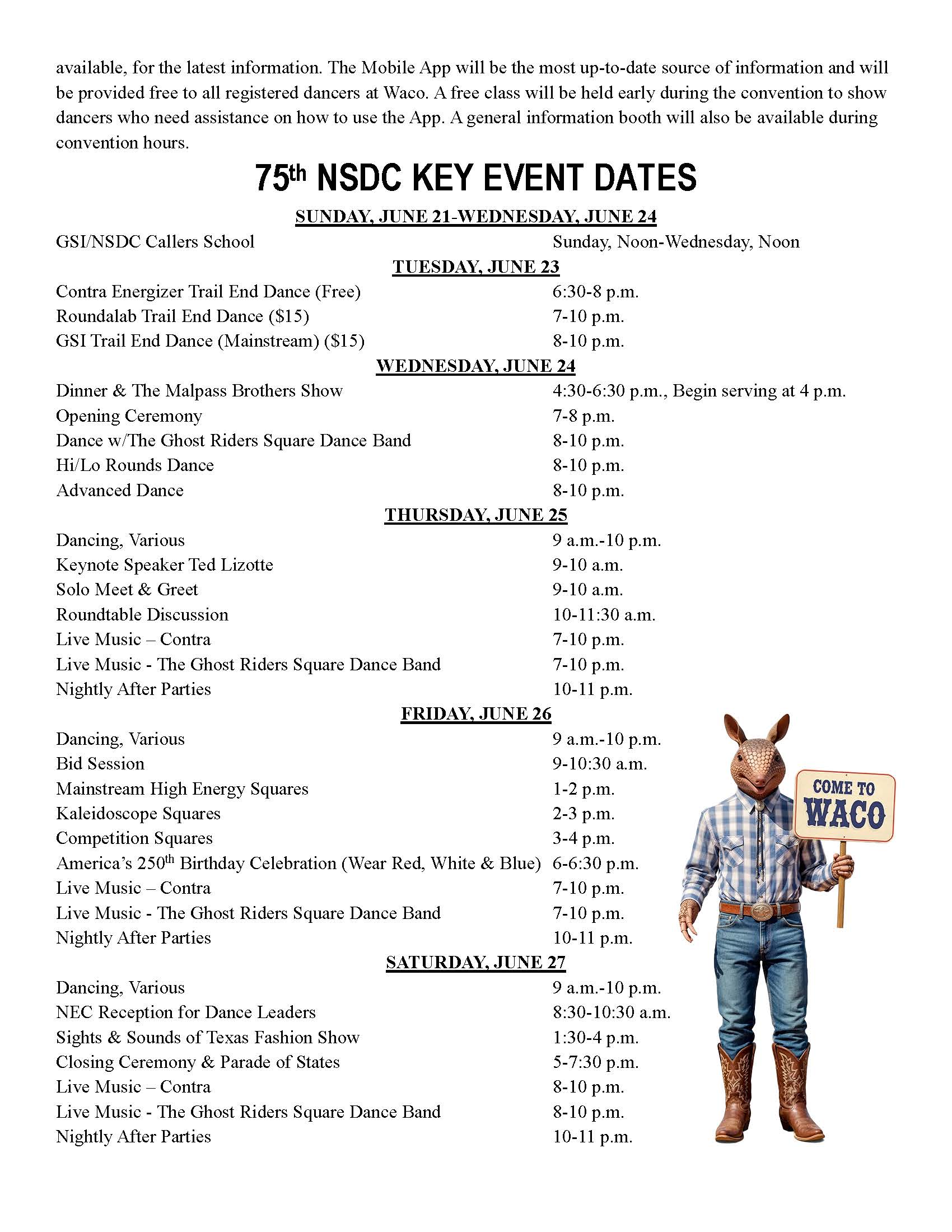 Links to Flyers 250 Celebration jpegDownload 250 Celebration pdfDownload 75th Fashion Show Brown Border Rev. 02.03.26Download 75th Fashion Show Brown Border Rev. 02.03.26 pdfDownload 75th NSDC April Square Off FundraiserDownload 75th NSDC April Square Off Fundraiser pdfDownload 75th NSDC Vendors FlyerDownload 75th NSDC Vendors Flyer pdfDownload Diamond Jubilee Red FlyerDownload Diamond Jubilee Red Flyer pdfDownload GSI_NSDC Callers School editedDownload GSI_NSDC Callers School edited pdfDownload Hotels Pet Friendly Updated 02.11.26Download Hotels Pet Friendly Updated 02.11.26 pdfDownload Main Events Flyer 2.15.2026_Page_1Download Main Events Flyer 2.15.2026_Page_2Download Main Events Flyer 2.15.2026 pdfDownload Make and Take ClassesDownload Make and Take Classes pdfDownload Malpass Brothers Sold OutDownload Malpass Brothers Sold Out pdfDownload Super Hero – Convention Rate Increase FlyerDownload Super Hero – Convention Rate Increase Flyer pdfDownload Waco Hotels Updated 02.11.26Download Waco Hotels Updated 02.11.26 pdfDownload Education Classes Potpourri FlyerDownload Education Classes Potpourri Flyer pdfDownload Finding Convention InformationDownload Finding Convention Information pdfDownload Hotels Pet Friendly Update 01.15.26Download Hotels Pet Friendly Update 01.15.26 pdfDownload Hotels Update 01.15.26Download Hotels Update 01.15.26 pdfDownload Pot of Gold Convention FlyerDownload Pot of Gold Convention Flyer pdfDownload Sew and Save ClassesDownload Sew and Save Classes pdfDownload Valentine Gift FlyerDownload Valentine Gift Flyer pdfDownload Bolos & Showcase FlyerDownload Bolos & Showcase Flyer pdfDownload Celebrating Our Vendors FlyerDownload Celebrating Our Vendors Flyer pdfDownload Education Classes Publicity & PromotionDownload Education Classes Publicity & Promotion pdfDownload Finalize Camping Reservations FlyerDownload Finalize Camping Reservations Flyer pdfDownload Ghost Riders Go Fund MeDownload Ghost Riders Go Fund Me pdfDownload NEC Archive Room Texas ConnectionDownload NEC Archive Room Texas Connection pdfDownload Trash DancingDownload Trash Dancing pdfDownload What to Do Flyer pdfDownload What to Do FlyerDownload Your First National Convention FlyerDownload Your First National Convention Flyer pdfDownload Convention Center FacilitiesDownload Convention Center Facilities pdfDownload Dance Leader Profile UpdateDownload Dance Leader Profile Update pdfDownload Volunteer Descriptions We Want YOUDownload Volunteer Descriptions We Want YOUDownload Fashion ShowDownload Fashion Show pdfDownload 75th Chicken adDownload 75th Chicken ad vpdfDownload Looking for Dance Leaders revisedDownload Looking for Dance Leaders revisedDownload Get your dance on flyerDownload Get your dance on flyer pdfDownload Getting to the 75th National Square Dance ConventionDownload Getting to the 75th National Square Dance Convention pdfDownload Ghost Riders GoFundMe infoDownload Ghost Riders GoFundMe info pdfDownload Ghost Riders Go Fund Me jpgDownload Ghost Riders Go Fund Me pdfDownload Hotels Revised 11.15.25Download Hotels Revised 11.15.25 pdfDownload Hotels Pet Friendly Revised 11.15.25Download Hotels Pet Friendly Revised 11.15.25 pdfDownload 75th Hotel UpdateDownload 75th Hotel Update pdfDownload 75 convention hotelsDownload 75 Convention HotelsDownload 75 Convention Hotels PetsDownload 75 Convention Hotels Pet FriendlyDownload 75th NSDC Hotel Booking PortalDownload 75th NSDC Hotel Booking Portal pdfDownload Camground FlyerDownload Camground Flyer pdfDownload Malpass-Brothers-Revised July 2025Download Malpass-Brothers-Revised July 2025Download Roundtable Panelists pg1Download Roundtable Panelists pg1 pdfDownload Roundtable Panelists pg2Download Roundtable Panelists pg2 pdfDownload Searching for InfoDownload Searching for Info pdfDownload Sights and Sounds FlyerDownload Sights and Sounds Flyer pdfDownload Tour Brochure pdfDownload Tour Brochure-1_Page_1Download Tour Brochure-1_Page_2Download self guided tours Waco Final_Page_1Download self guided tours Waco Final_Page_2Download self guided tours Waco Final_Page_3Download Self guided Tours WacoDownload Benefits of Volunteering jpegDownload Benefits of Volunteering pdfDownload Convention Autumn Generic Flyer jpegDownload Convention Autumn Generic Flyer pdfDownload Keynote Speaker Ted Lizotte jpegDownload Keynote Speaker Ted Lizotte pdfDownload Leadership Certification Program jpegDownload Leadership Certification Program pdfDownload Looking for Dance Leaders jpegDownload Looking for Dance Leaders pdfDownload Organizational Roundtable Pink jpegDownload Organizational Roundtable Pink pdfDownload Organizational Roundtable Vibrant jpegDownload Organizational Roundtable Vibrant pdfDownload Visit the silos jpegDownload Visit the silos pdfDownload Volunteer Descriptions We Want You jpegDownload Volunteer Descriptions We Want You pdfDownload Wear Red, White & Blue Flyer2 jpegDownload Wear Red, White & Blue Flyer2 pdfDownload What Waco CC Offers jpegDownload What Waco CC Offers pdfDownload Youth Activities Flyer jpegDownload Youth Activities Flyer pdfDownload Convention_App_Announcement[1]Download Education_Dancer_Leadership_Classes[1]Download Education Dancer Leadership Classes pdfDownload Ghost_Riders_Go_Fund_Me[1]Download Ghost Riders Go Fund Me pdfDownload LCP_Diamonds_in_Your_Bag_Flyer[1]Download LCP Diamonds in Your Bag Flyer pdfDownload Longhorn_Are_You_Registered[1]Download Longhorn Are You Registered pdfDownload Looking_for_Callers_rev_10.15.25[1]Download Looking for Callers rev 10.15.25 pdfDownload National_Square_Dance_Day[1]Download National Square Dance Day pdfDownload Reasons_to_Attend_Convention_Flyer[1]Download Reasons to Attend Convention Flyer pdfDownload Waco_Dining_Guide_Flyer[1]Download Waco Dining Guide Flyer pdfDownload 75NSDC Diamond Jubilee 2025 flyerDownload Diamond Jubilee Flyer pdfDownload