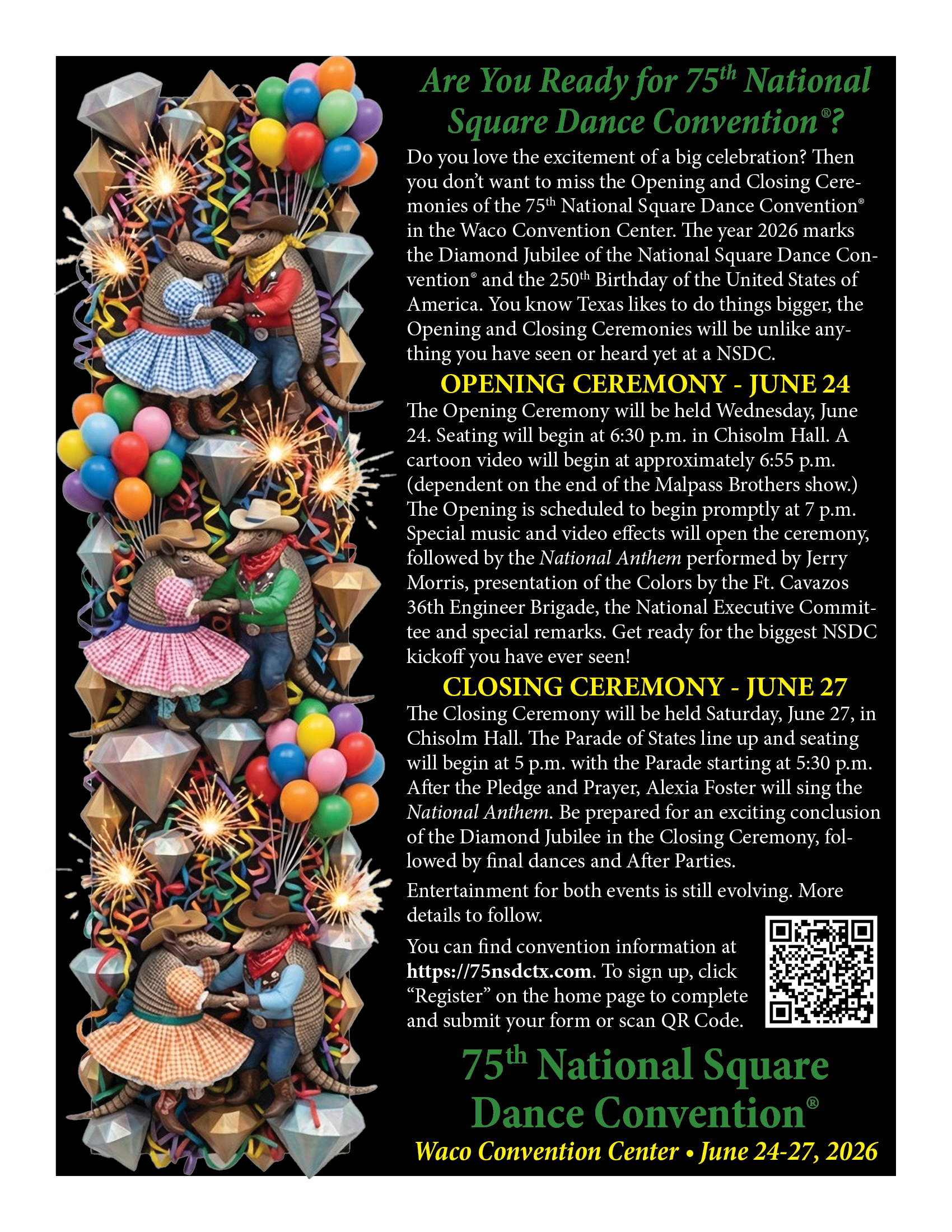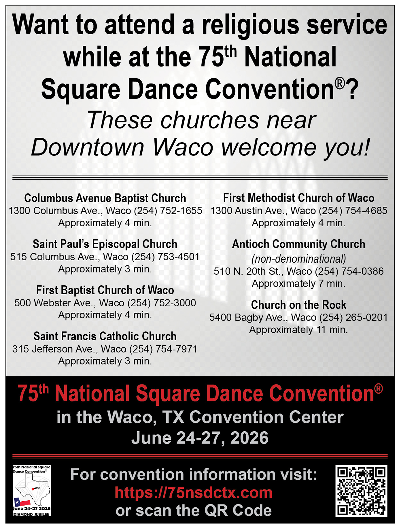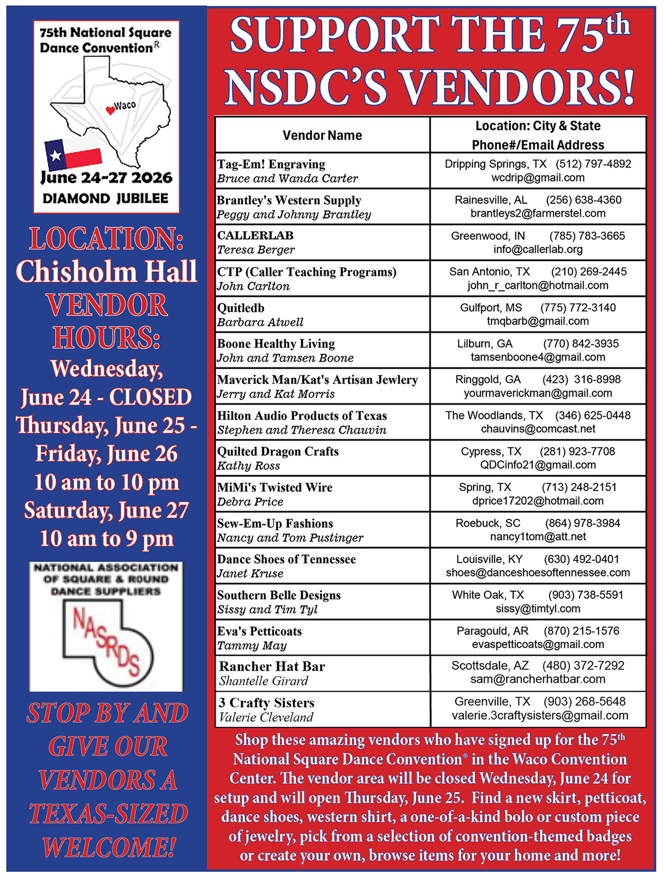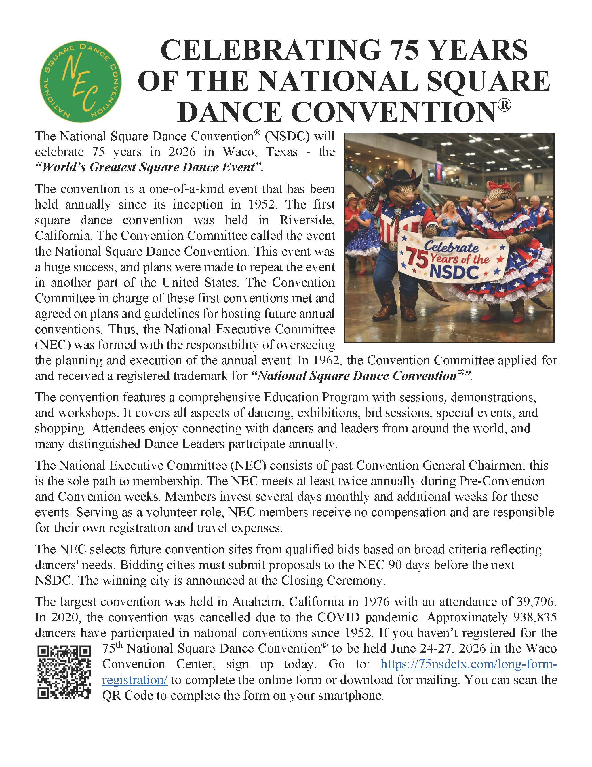 Links to Flyers 250 Celebration jpegDownload 250 Celebration pdfDownload 75th NSDC Vendors Flyer Rev. 4.2.26Download 75th NSDC Vendors Flyer Rev. 4.2.26pdfDownload AFTERParty Friday June 26 10-11 pm – 1Download AFTERParty Friday June 26 RoadhouseContrapdfDownload AFTERPartyThursJune25TechnoContraDownload AFTERParty Thurs June 25 TechnoContrapdfDownload America’s Birthday Invitation V2Download America’s Birthday Invitation V2pdfDownload ARTS After PartyDownload ARTS After PartypdfDownload Contra Callers Page 1Download Contra Callers Page 1pdfDownload Contra Callers Page 2Download Contra callers Page 2pdfDownload Contra Clinics at the 75th NSDCDownload Contra Clinics at the 75th NSDCpdfDownload Education Diamonds April FlyerDownload Education Diamonds April FlyerpdfDownload Exhibition Groups FlyerDownload Exhibition Groups FlyerpdfDownload Food Options FlyerDownload Food Options FlyerpdfDownload Live Music in the Contra Hall – 1Download Live Music in the Contra HallpdfDownload Scooter FlyerDownload Scooter FlyerpdfDownload Services and Security FlyerDownload Services and Security FlyerpdfDownload Waco Church ServicesDownload Waco Church ServicespdfDownload Waco StreakDownload Waco StreakpdfDownload Wednesday Night Event PlannerDownload Wednesday Night Event PlannerpdfDownload Wooly Mammoth MonumentDownload Wooly Mammoth MonumentpdfDownload Classes New and Future CallersDownload Classes New and Future Callers pdfDownload Dancing on the BrazosDownload Dancing on the Brazos pdfDownload Future Convention ClasssesDownload Future Convention Classses pdfDownload Keynote, Roundtable MarchDownload Keynote, Roundtable March pdfDownload LCP MarchDownload LCP March pdfDownload NEC Archives MarchDownload NEC Archives March pdfDownload NSDC Celebrates 75th Year pg1Download NSDC Celebrates 75th Year pg2Download NSDC Celebrates 75th Year pdfDownload Opening and Closing Ceremonies TeaserDownload Opening and Closing Ceremonies Teaser pdfDownload Sew & Save MarchDownload Sew & Save March pdfDownload Tours Flyer MarchDownload Tours Flyer March pdfDownload Transportation in WacoDownload Transportation in Waco pdfDownload Ways to WinDownload Ways to Win pdfDownload 75th Fashion Show Brown Border Rev. 02.03.26 pdfDownload 75th NSDC April Square Off FundraiserDownload 75th NSDC April Square Off Fundraiser pdfDownload 75th NSDC Vendors FlyerDownload 75th NSDC Vendors Flyer pdfDownload Diamond Jubilee Red FlyerDownload Diamond Jubilee Red Flyer pdfDownload GSI_NSDC Callers School editedDownload GSI_NSDC Callers School edited pdfDownload Hotels Pet Friendly Updated 02.11.26Download Hotels Pet Friendly Updated 02.11.26 pdfDownload Main Events Flyer 2.15.2026_Page_1Download Main Events Flyer 2.15.2026_Page_2Download Main Events Flyer 2.15.2026 pdfDownload Make and Take ClassesDownload Make and Take Classes pdfDownload Malpass Brothers Sold OutDownload Malpass Brothers Sold Out pdfDownload Super Hero – Convention Rate Increase FlyerDownload Super Hero – Convention Rate Increase Flyer pdfDownload Waco Hotels Updated 02.11.26Download Waco Hotels Updated 02.11.26 pdfDownload Education Classes Potpourri FlyerDownload Education Classes Potpourri Flyer pdfDownload Finding Convention InformationDownload Finding Convention Information pdfDownload Hotels Pet Friendly Update 01.15.26Download Hotels Pet Friendly Update 01.15.26 pdfDownload Hotels Update 01.15.26Download Hotels Update 01.15.26 pdfDownload Pot of Gold Convention FlyerDownload Pot of Gold Convention Flyer pdfDownload Sew and Save ClassesDownload Sew and Save Classes pdfDownload Valentine Gift FlyerDownload Valentine Gift Flyer pdfDownload Bolos & Showcase FlyerDownload Bolos & Showcase Flyer pdfDownload Celebrating Our Vendors FlyerDownload Celebrating Our Vendors Flyer pdfDownload Education Classes Publicity & PromotionDownload Education Classes Publicity & Promotion pdfDownload Finalize Camping Reservations FlyerDownload Finalize Camping Reservations Flyer pdfDownload Ghost Riders Go Fund MeDownload Ghost Riders Go Fund Me pdfDownload NEC Archive Room Texas ConnectionDownload NEC Archive Room Texas Connection pdfDownload Trash DancingDownload Trash Dancing pdfDownload What to Do Flyer pdfDownload What to Do FlyerDownload Your First National Convention FlyerDownload Your First National Convention Flyer pdfDownload Convention Center FacilitiesDownload Convention Center Facilities pdfDownload Dance Leader Profile UpdateDownload Dance Leader Profile Update pdfDownload Volunteer Descriptions We Want YOUDownload Volunteer Descriptions We Want YOUDownload Fashion ShowDownload Fashion Show pdfDownload 75th Chicken adDownload 75th Chicken ad vpdfDownload Looking for Dance Leaders revisedDownload Looking for Dance Leaders revisedDownload Get your dance on flyerDownload Get your dance on flyer pdfDownload Getting to the 75th National Square Dance ConventionDownload Getting to the 75th National Square Dance Convention pdfDownload Ghost Riders GoFundMe infoDownload Ghost Riders GoFundMe info pdfDownload Ghost Riders Go Fund Me jpgDownload Ghost Riders Go Fund Me pdfDownload Hotels Revised 11.15.25Download Hotels Revised 11.15.25 pdfDownload Hotels Pet Friendly Revised 11.15.25Download Hotels Pet Friendly Revised 11.15.25 pdfDownload 75th Hotel UpdateDownload 75th Hotel Update pdfDownload 75 convention hotelsDownload 75 Convention HotelsDownload 75 Convention Hotels PetsDownload 75 Convention Hotels Pet FriendlyDownload 75th NSDC Hotel Booking PortalDownload 75th NSDC Hotel Booking Portal pdfDownload Camground FlyerDownload Camground Flyer pdfDownload Malpass-Brothers-Revised July 2025Download Malpass-Brothers-Revised July 2025Download Roundtable Panelists pg1Download Roundtable Panelists pg1 pdfDownload Roundtable Panelists pg2Download Roundtable Panelists pg2 pdfDownload Searching for InfoDownload Searching for Info pdfDownload Sights and Sounds FlyerDownload Sights and Sounds Flyer pdfDownload Tour Brochure pdfDownload Tour Brochure-1_Page_1Download Tour Brochure