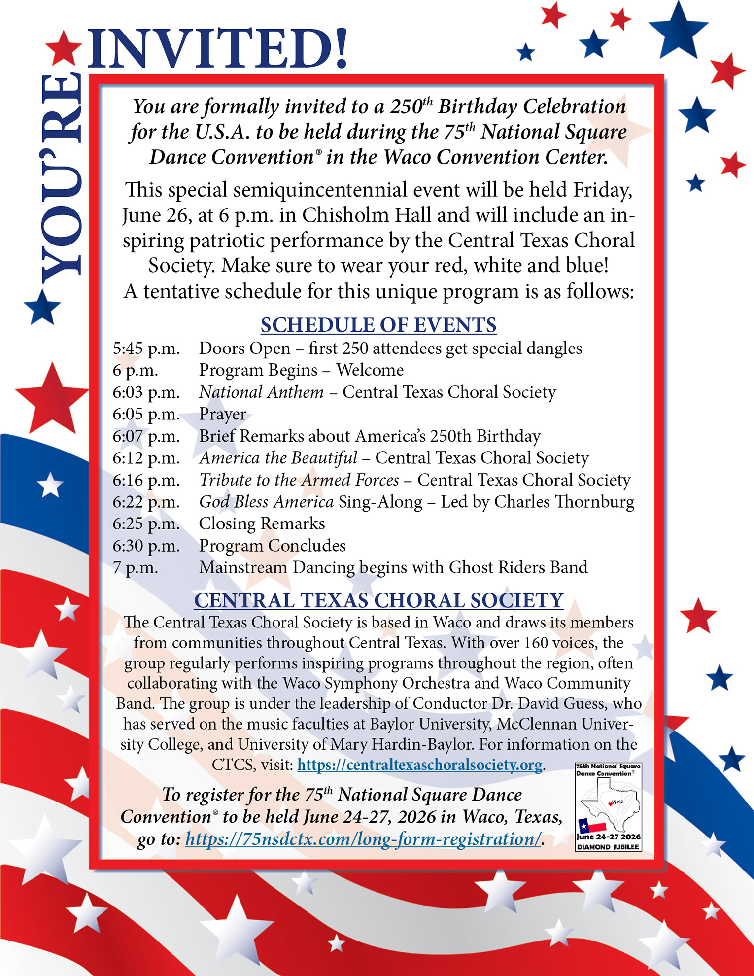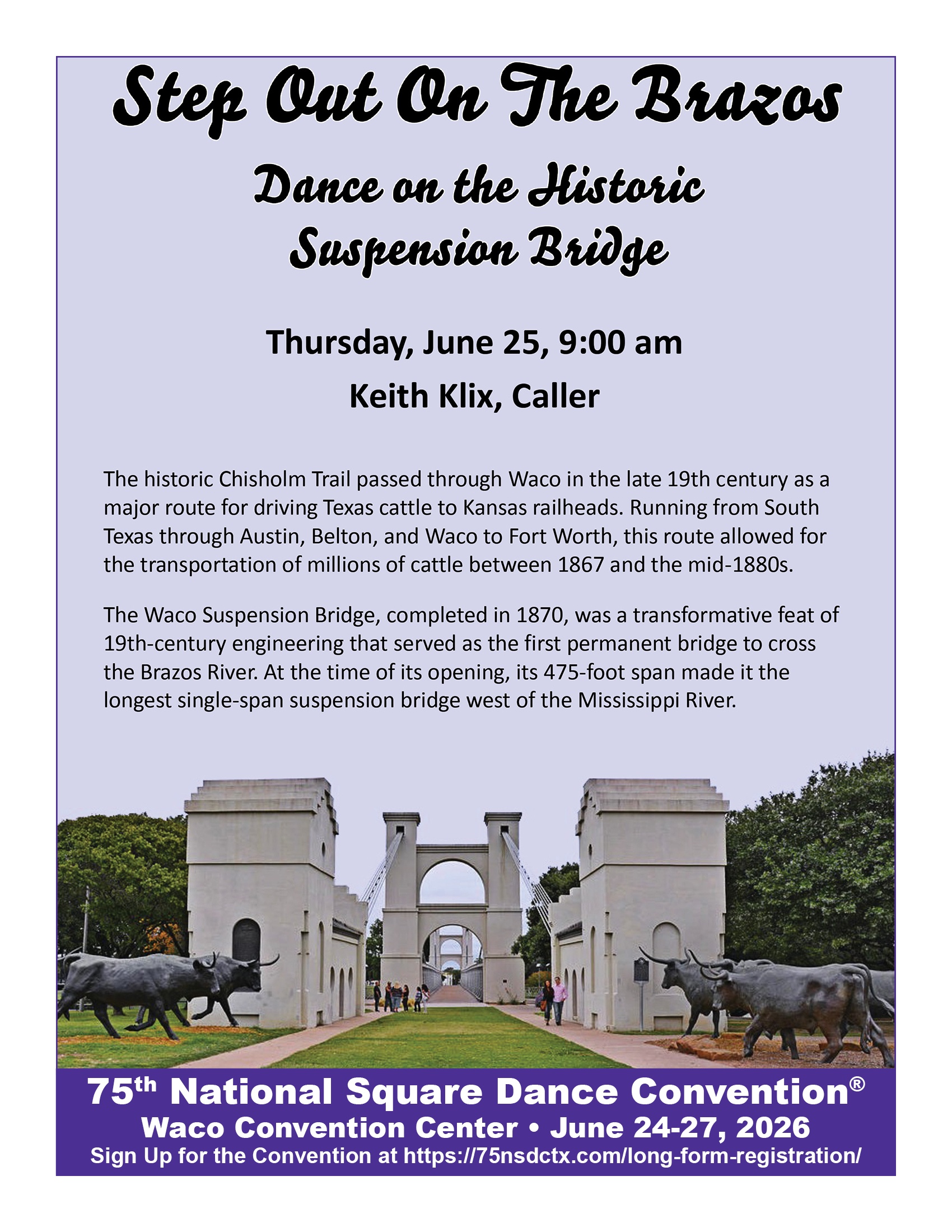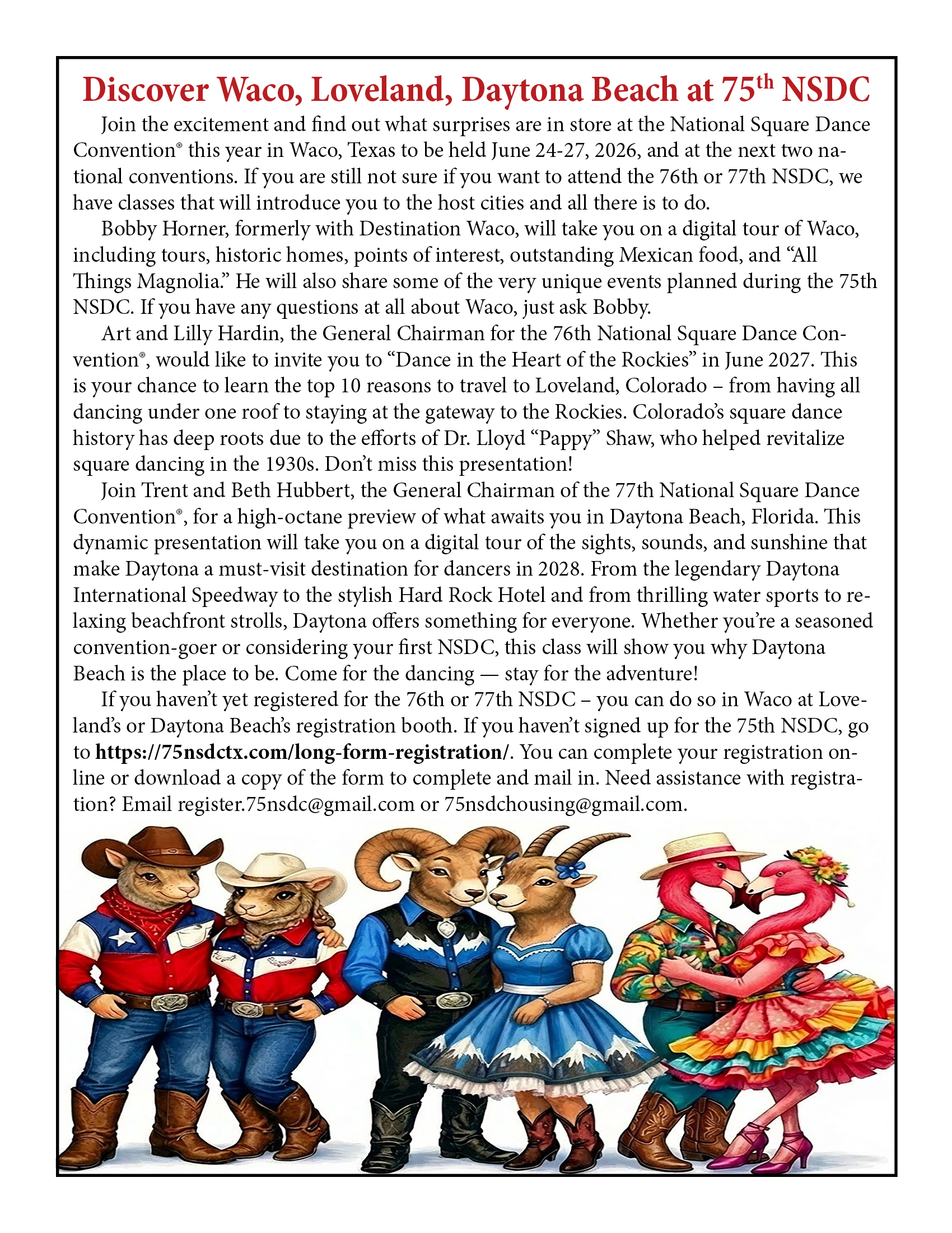 Links to Flyers 250 Celebration jpegDownload 250 Celebration pdfDownload 75th NSDC Vendors Flyer Rev. 4.2.26Download 75th NSDC Vendors Flyer Rev. 4.2.26pdfDownload AFTERParty Friday June 26 10-11 pm – 1Download AFTERParty Friday June 26 RoadhouseContrapdfDownload AFTERPartyThursJune25TechnoContraDownload AFTERParty Thurs June 25 TechnoContrapdfDownload America’s Birthday Invitation V2Download America’s Birthday Invitation V2pdfDownload ARTS After PartyDownload ARTS After PartypdfDownload Contra Callers Page 1Download Contra Callers Page 1pdfDownload Contra Callers Page 2Download Contra callers Page 2pdfDownload Contra Clinics at the 75th NSDCDownload Contra Clinics at the 75th NSDCpdfDownload Education Diamonds April FlyerDownload Education Diamonds April FlyerpdfDownload Exhibition Groups FlyerDownload Exhibition Groups FlyerpdfDownload Food Options FlyerDownload Food Options FlyerpdfDownload Live Music in the Contra Hall – 1Download Live Music in the Contra HallpdfDownload Scooter FlyerDownload Scooter FlyerpdfDownload Services and Security FlyerDownload Services and Security FlyerpdfDownload Waco Church ServicesDownload Waco Church ServicespdfDownload Waco StreakDownload Waco StreakpdfDownload Wednesday Night Event PlannerDownload Wednesday Night Event PlannerpdfDownload Wooly Mammoth MonumentDownload Wooly Mammoth MonumentpdfDownload Classes New and Future CallersDownload Classes New and Future Callers pdfDownload Dancing on the BrazosDownload Dancing on the Brazos pdfDownload Future Convention ClasssesDownload Future Convention Classses pdfDownload Keynote, Roundtable MarchDownload Keynote, Roundtable March pdfDownload LCP MarchDownload LCP March pdfDownload NEC Archives MarchDownload NEC Archives March pdfDownload NSDC Celebrates 75th Year pg1Download NSDC Celebrates 75th Year pg2Download NSDC Celebrates 75th Year pdfDownload Opening and Closing Ceremonies TeaserDownload Opening and Closing Ceremonies Teaser pdfDownload Sew & Save MarchDownload Sew & Save March pdfDownload Tours Flyer MarchDownload Tours Flyer March pdfDownload Transportation in WacoDownload Transportation in Waco pdfDownload Ways to WinDownload Ways to Win pdfDownload 75th Fashion Show Brown Border Rev. 02.03.26 pdfDownload 75th NSDC April Square Off FundraiserDownload 75th NSDC April Square Off Fundraiser pdfDownload 75th NSDC Vendors FlyerDownload 75th NSDC Vendors Flyer pdfDownload Diamond Jubilee Red FlyerDownload Diamond Jubilee Red Flyer pdfDownload GSI_NSDC Callers School editedDownload GSI_NSDC Callers School edited pdfDownload Hotels Pet Friendly Updated 02.11.26Download Hotels Pet Friendly Updated 02.11.26 pdfDownload Main Events Flyer 2.15.2026_Page_1Download Main Events Flyer 2.15.2026_Page_2Download Main Events Flyer 2.15.2026 pdfDownload Make and Take ClassesDownload Make and Take Classes pdfDownload Malpass Brothers Sold OutDownload Malpass Brothers Sold Out pdfDownload Super Hero – Convention Rate Increase FlyerDownload Super Hero – Convention Rate Increase Flyer pdfDownload Waco Hotels Updated 02.11.26Download Waco Hotels Updated 02.11.26 pdfDownload Education Classes Potpourri FlyerDownload Education Classes Potpourri Flyer pdfDownload Finding Convention InformationDownload Finding Convention Information pdfDownload Hotels Pet Friendly Update 01.15.26Download Hotels Pet Friendly Update 01.15.26 pdfDownload Hotels Update 01.15.26Download Hotels Update 01.15.26 pdfDownload Pot of Gold Convention FlyerDownload Pot of Gold Convention Flyer pdfDownload Sew and Save ClassesDownload Sew and Save Classes pdfDownload Valentine Gift FlyerDownload Valentine Gift Flyer pdfDownload Bolos & Showcase FlyerDownload Bolos & Showcase Flyer pdfDownload Celebrating Our Vendors FlyerDownload Celebrating Our Vendors Flyer pdfDownload Education Classes Publicity & PromotionDownload Education Classes Publicity & Promotion pdfDownload Finalize Camping Reservations FlyerDownload Finalize Camping Reservations Flyer pdfDownload Ghost Riders Go Fund MeDownload Ghost Riders Go Fund Me pdfDownload NEC Archive Room Texas ConnectionDownload NEC Archive Room Texas Connection pdfDownload Trash DancingDownload Trash Dancing pdfDownload What to Do Flyer pdfDownload What to Do FlyerDownload Your First National Convention FlyerDownload Your First National Convention Flyer pdfDownload Convention Center FacilitiesDownload Convention Center Facilities pdfDownload Dance Leader Profile UpdateDownload Dance Leader Profile Update pdfDownload Volunteer Descriptions We Want YOUDownload Volunteer Descriptions We Want YOUDownload Fashion ShowDownload Fashion Show pdfDownload 75th Chicken adDownload 75th Chicken ad vpdfDownload Looking for Dance Leaders revisedDownload Looking for Dance Leaders revisedDownload Get your dance on flyerDownload Get your dance on flyer pdfDownload Getting to the 75th National Square Dance ConventionDownload Getting to the 75th National Square Dance Convention pdfDownload Ghost Riders GoFundMe infoDownload Ghost Riders GoFundMe info pdfDownload Ghost Riders Go Fund Me jpgDownload Ghost Riders Go Fund Me pdfDownload Hotels Revised 11.15.25Download Hotels Revised 11.15.25 pdfDownload Hotels Pet Friendly Revised 11.15.25Download Hotels Pet Friendly Revised 11.15.25 pdfDownload 75th Hotel UpdateDownload 75th Hotel Update pdfDownload 75 convention hotelsDownload 75 Convention HotelsDownload 75 Convention Hotels PetsDownload 75 Convention Hotels Pet FriendlyDownload 75th NSDC Hotel Booking PortalDownload 75th NSDC Hotel Booking Portal pdfDownload Camground FlyerDownload Camground Flyer pdfDownload Malpass-Brothers-Revised July 2025Download Malpass-Brothers-Revised July 2025Download Roundtable Panelists pg1Download Roundtable Panelists pg1 pdfDownload Roundtable Panelists pg2Download Roundtable Panelists pg2 pdfDownload Searching for InfoDownload Searching for Info pdfDownload Sights and Sounds FlyerDownload Sights and Sounds Flyer pdfDownload Tour Brochure pdfDownload Tour Brochure-1_Page_1Download Tour Brochure