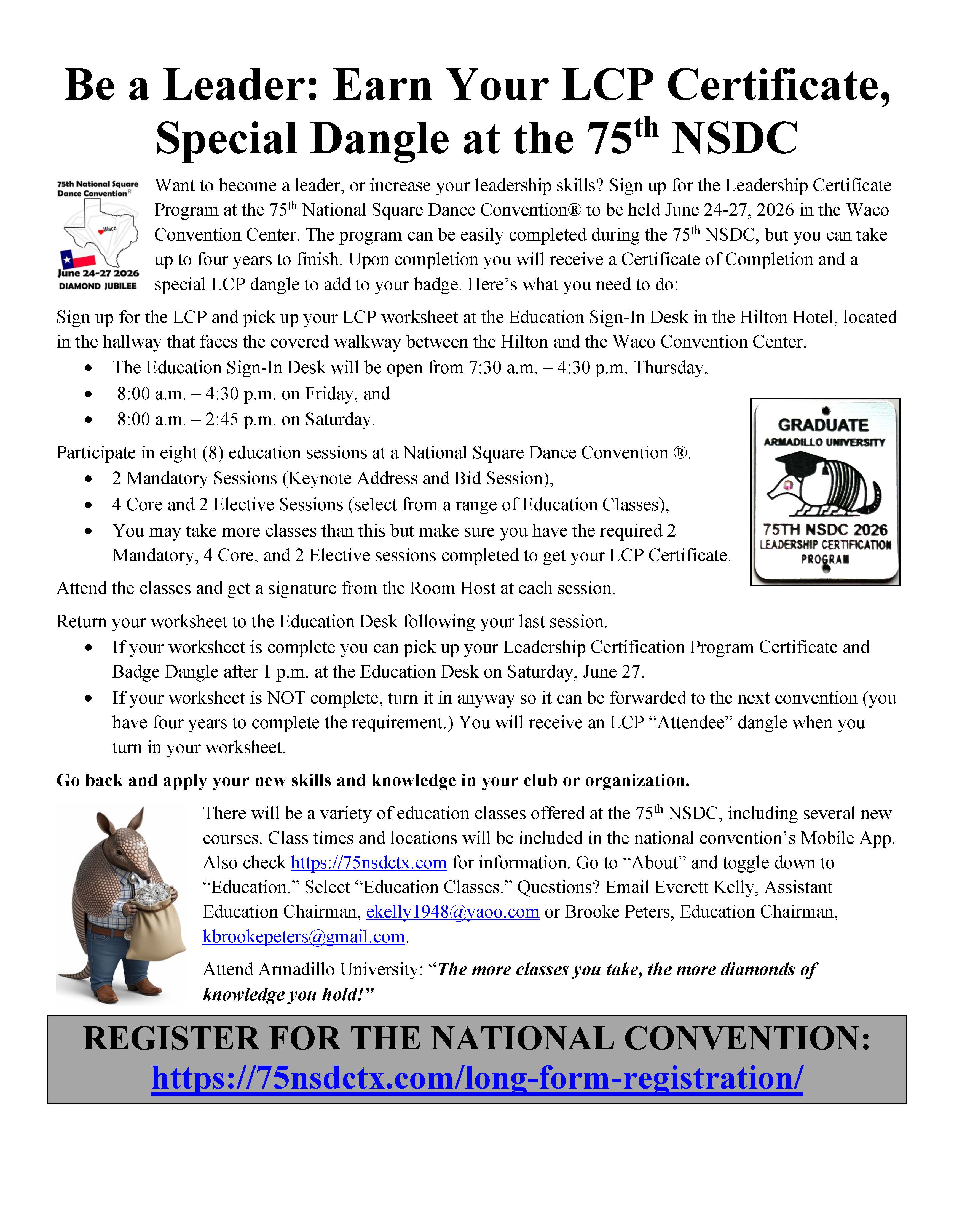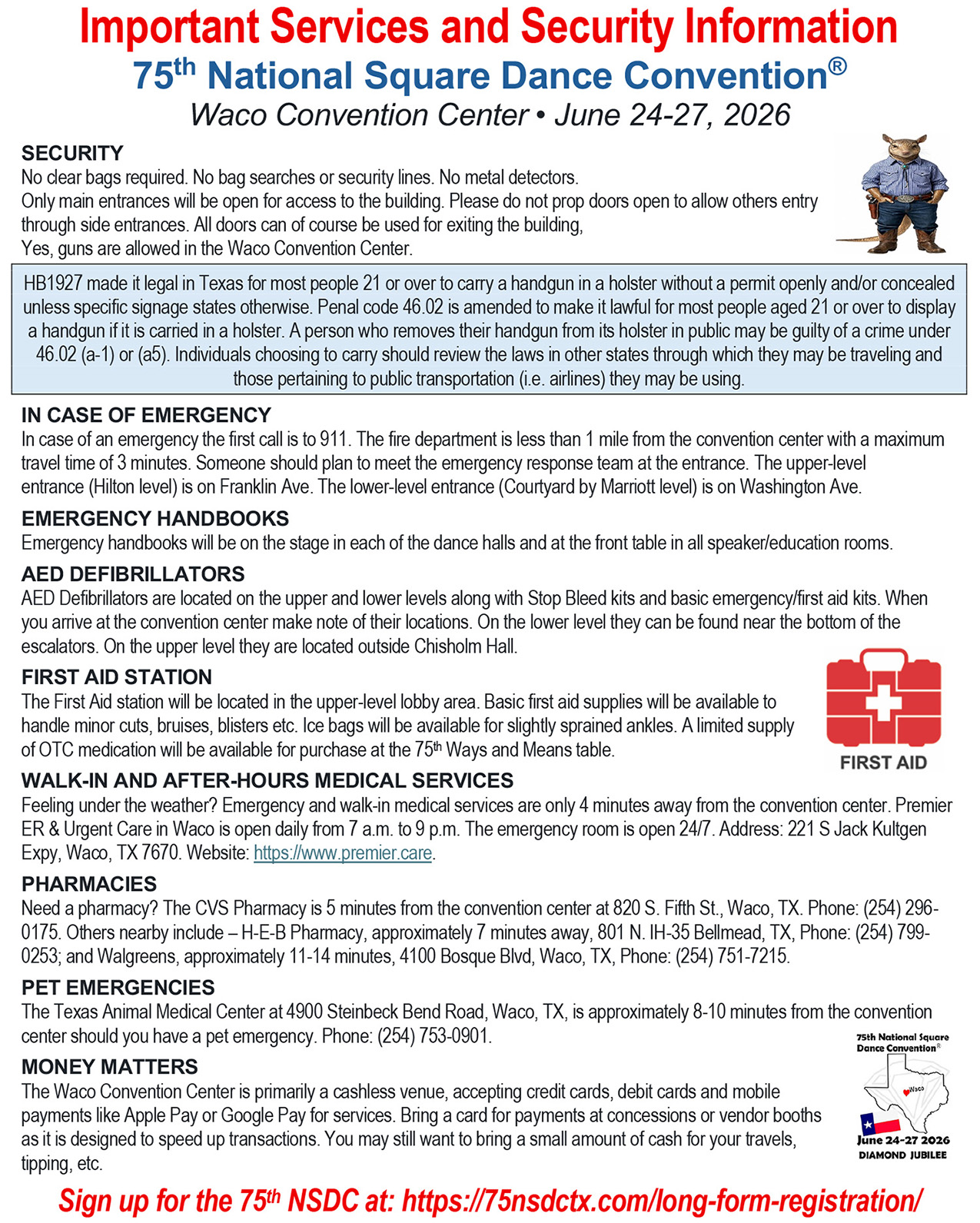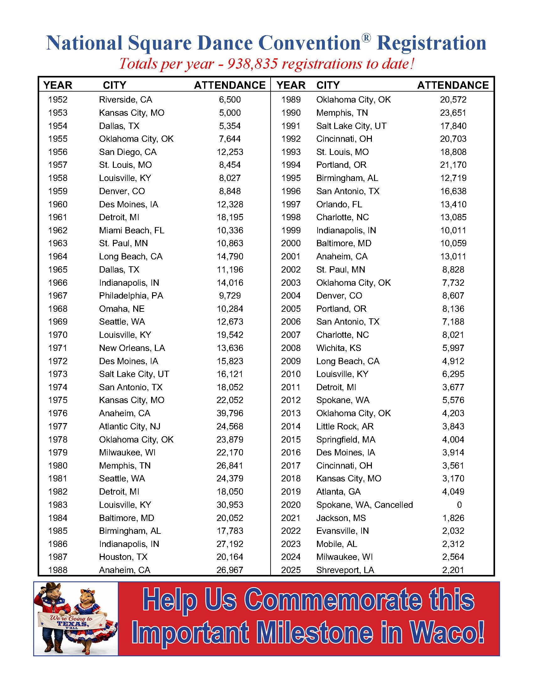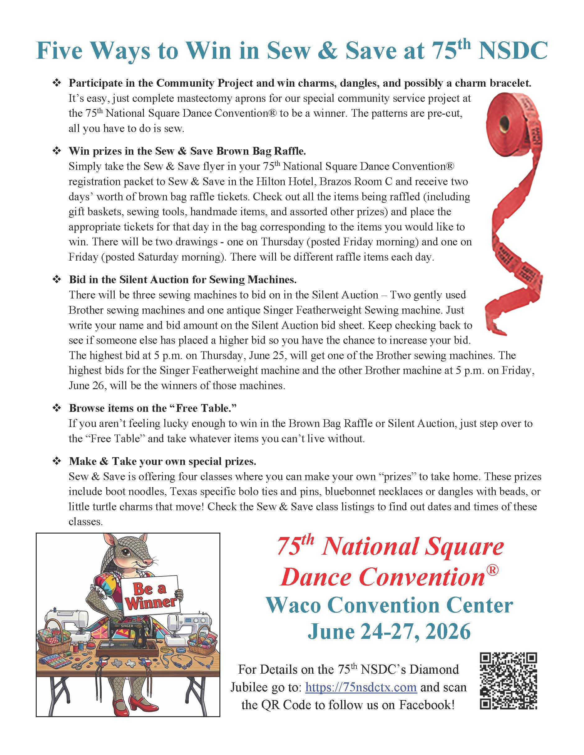 Links to Flyers 250 Celebration jpegDownload 250 Celebration pdfDownload 75th NSDC Vendors Flyer Rev. 4.2.26Download 75th NSDC Vendors Flyer Rev. 4.2.26pdfDownload AFTERParty Friday June 26 10-11 pm – 1Download AFTERParty Friday June 26 RoadhouseContrapdfDownload AFTERPartyThursJune25TechnoContraDownload AFTERParty Thurs June 25 TechnoContrapdfDownload America’s Birthday Invitation V2Download America’s Birthday Invitation V2pdfDownload ARTS After PartyDownload ARTS After PartypdfDownload Contra Callers Page 1Download Contra Callers Page 1pdfDownload Contra Callers Page 2Download Contra callers Page 2pdfDownload Contra Clinics at the 75th NSDCDownload Contra Clinics at the 75th NSDCpdfDownload Education Diamonds April FlyerDownload Education Diamonds April FlyerpdfDownload Exhibition Groups FlyerDownload Exhibition Groups FlyerpdfDownload Food Options FlyerDownload Food Options FlyerpdfDownload Live Music in the Contra Hall – 1Download Live Music in the Contra HallpdfDownload Scooter FlyerDownload Scooter FlyerpdfDownload Services and Security FlyerDownload Services and Security FlyerpdfDownload Waco Church ServicesDownload Waco Church ServicespdfDownload Waco StreakDownload Waco StreakpdfDownload Wednesday Night Event PlannerDownload Wednesday Night Event PlannerpdfDownload Wooly Mammoth MonumentDownload Wooly Mammoth MonumentpdfDownload Classes New and Future CallersDownload Classes New and Future Callers pdfDownload Dancing on the BrazosDownload Dancing on the Brazos pdfDownload Future Convention ClasssesDownload Future Convention Classses pdfDownload Keynote, Roundtable MarchDownload Keynote, Roundtable March pdfDownload LCP MarchDownload LCP March pdfDownload NEC Archives MarchDownload NEC Archives March pdfDownload NSDC Celebrates 75th Year pg1Download NSDC Celebrates 75th Year pg2Download NSDC Celebrates 75th Year pdfDownload Opening and Closing Ceremonies TeaserDownload Opening and Closing Ceremonies Teaser pdfDownload Sew & Save MarchDownload Sew & Save March pdfDownload Tours Flyer MarchDownload Tours Flyer March pdfDownload Transportation in WacoDownload Transportation in Waco pdfDownload Ways to WinDownload Ways to Win pdfDownload 75th Fashion Show Brown Border Rev. 02.03.26 pdfDownload 75th NSDC April Square Off FundraiserDownload 75th NSDC April Square Off Fundraiser pdfDownload 75th NSDC Vendors FlyerDownload 75th NSDC Vendors Flyer pdfDownload Diamond Jubilee Red FlyerDownload Diamond Jubilee Red Flyer pdfDownload GSI_NSDC Callers School editedDownload GSI_NSDC Callers School edited pdfDownload Hotels Pet Friendly Updated 02.11.26Download Hotels Pet Friendly Updated 02.11.26 pdfDownload Main Events Flyer 2.15.2026_Page_1Download Main Events Flyer 2.15.2026_Page_2Download Main Events Flyer 2.15.2026 pdfDownload Make and Take ClassesDownload Make and Take Classes pdfDownload Malpass Brothers Sold OutDownload Malpass Brothers Sold Out pdfDownload Super Hero – Convention Rate Increase FlyerDownload Super Hero – Convention Rate Increase Flyer pdfDownload Waco Hotels Updated 02.11.26Download Waco Hotels Updated 02.11.26 pdfDownload Education Classes Potpourri FlyerDownload Education Classes Potpourri Flyer pdfDownload Finding Convention InformationDownload Finding Convention Information pdfDownload Hotels Pet Friendly Update 01.15.26Download Hotels Pet Friendly Update 01.15.26 pdfDownload Hotels Update 01.15.26Download Hotels Update 01.15.26 pdfDownload Pot of Gold Convention FlyerDownload Pot of Gold Convention Flyer pdfDownload Sew and Save ClassesDownload Sew and Save Classes pdfDownload Valentine Gift FlyerDownload Valentine Gift Flyer pdfDownload Bolos & Showcase FlyerDownload Bolos & Showcase Flyer pdfDownload Celebrating Our Vendors FlyerDownload Celebrating Our Vendors Flyer pdfDownload Education Classes Publicity & PromotionDownload Education Classes Publicity & Promotion pdfDownload Finalize Camping Reservations FlyerDownload Finalize Camping Reservations Flyer pdfDownload Ghost Riders Go Fund MeDownload Ghost Riders Go Fund Me pdfDownload NEC Archive Room Texas ConnectionDownload NEC Archive Room Texas Connection pdfDownload Trash DancingDownload Trash Dancing pdfDownload What to Do Flyer pdfDownload What to Do FlyerDownload Your First National Convention FlyerDownload Your First National Convention Flyer pdfDownload Convention Center FacilitiesDownload Convention Center Facilities pdfDownload Dance Leader Profile UpdateDownload Dance Leader Profile Update pdfDownload Volunteer Descriptions We Want YOUDownload Volunteer Descriptions We Want YOUDownload Fashion ShowDownload Fashion Show pdfDownload 75th Chicken adDownload 75th Chicken ad vpdfDownload Looking for Dance Leaders revisedDownload Looking for Dance Leaders revisedDownload Get your dance on flyerDownload Get your dance on flyer pdfDownload Getting to the 75th National Square Dance ConventionDownload Getting to the 75th National Square Dance Convention pdfDownload Ghost Riders GoFundMe infoDownload Ghost Riders GoFundMe info pdfDownload Ghost Riders Go Fund Me jpgDownload Ghost Riders Go Fund Me pdfDownload Hotels Revised 11.15.25Download Hotels Revised 11.15.25 pdfDownload Hotels Pet Friendly Revised 11.15.25Download Hotels Pet Friendly Revised 11.15.25 pdfDownload 75th Hotel UpdateDownload 75th Hotel Update pdfDownload 75 convention hotelsDownload 75 Convention HotelsDownload 75 Convention Hotels PetsDownload 75 Convention Hotels Pet FriendlyDownload 75th NSDC Hotel Booking PortalDownload 75th NSDC Hotel Booking Portal pdfDownload Camground FlyerDownload Camground Flyer pdfDownload Malpass-Brothers-Revised July 2025Download Malpass-Brothers-Revised July 2025Download Roundtable Panelists pg1Download Roundtable Panelists pg1 pdfDownload Roundtable Panelists pg2Download Roundtable Panelists pg2 pdfDownload Searching for InfoDownload Searching for Info pdfDownload Sights and Sounds FlyerDownload Sights and Sounds Flyer pdfDownload Tour Brochure pdfDownload Tour Brochure-1_Page_1Download Tour Brochure